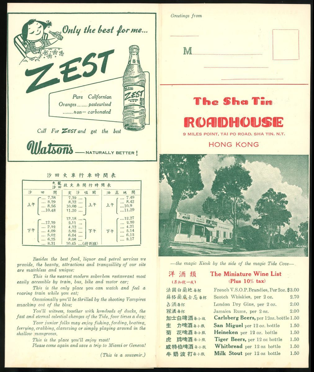 1960s a menu from The Sha Tin Roadhouse, a restaurant located at 9 Mile, Tai Po Road. It closed in the late 1970s.
