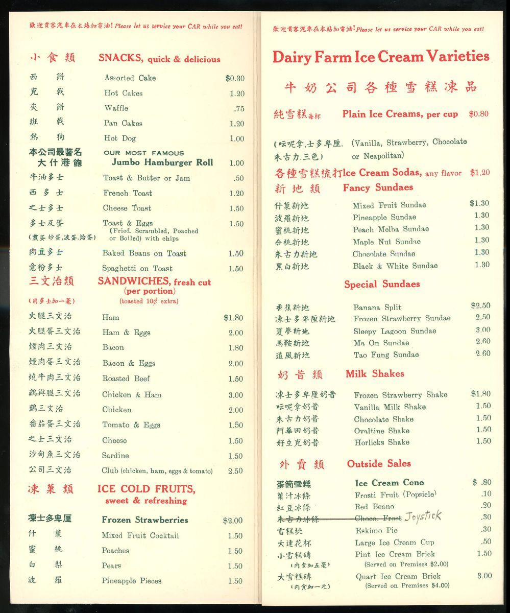 1960年沙田牛奶公司餐廳 (The Sha Tin Roadhouse) 餐牌一份, 該餐廳 位於大埔公路九咪, 在1970年代末結業.