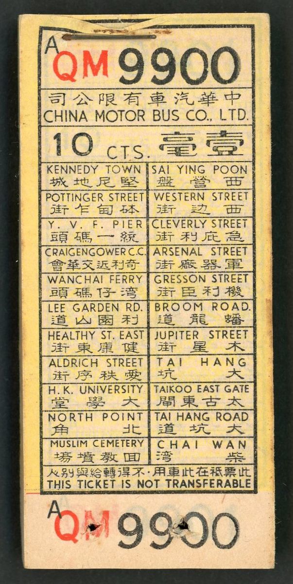 1960年代中華汽車有限公司壹角車票一叠, 原釘裝. No.QM9900-QM9999. 共一百枚. 最後一枚有破裂. 少見.
