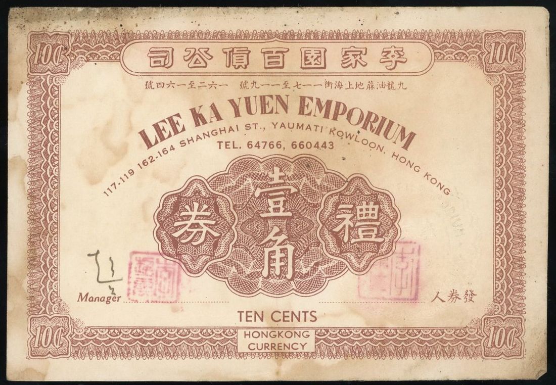 1960s Kowloon Lee Ka Yuen Emporium 10 cents gift certificate, serial number: 100812, with embossed stamp and double seals. some stained.
