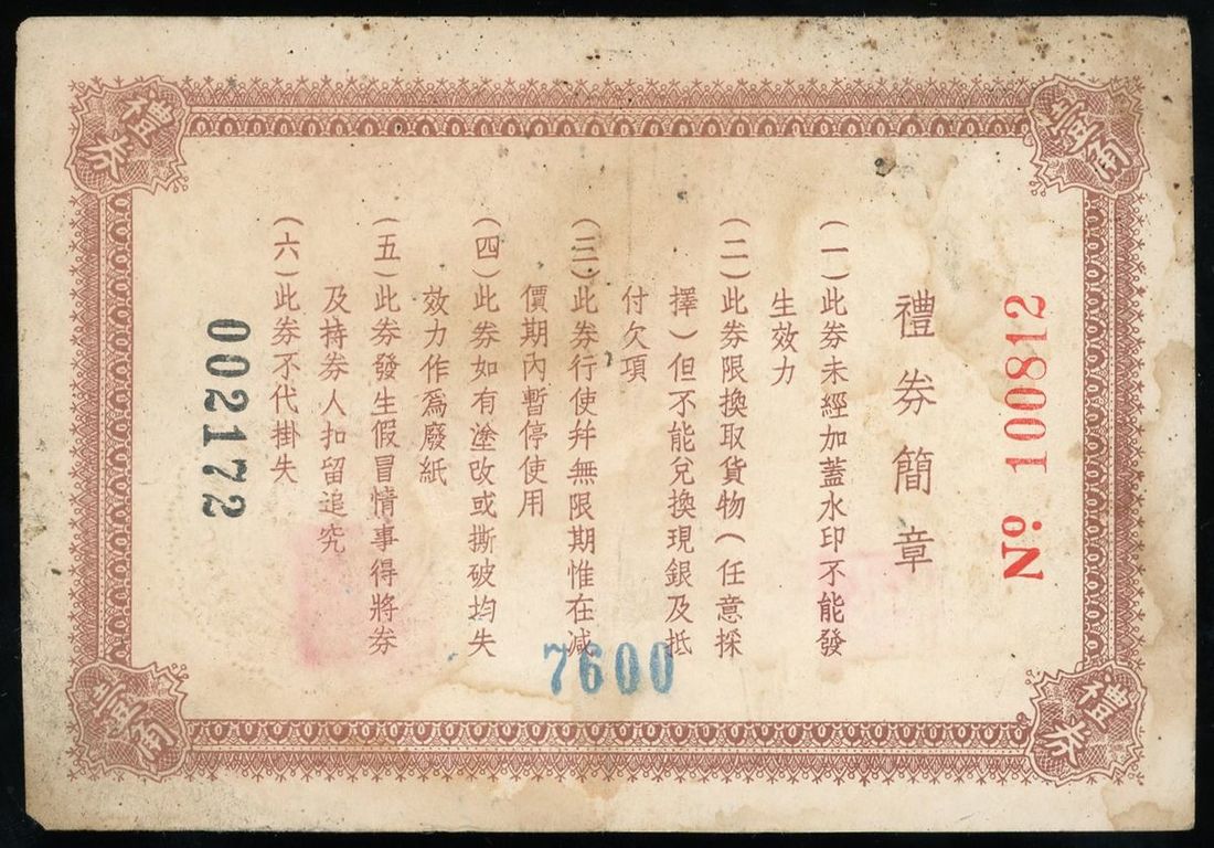 1960年代九龍李家園百貨公司壹角禮券, 編号:100812, 有擊凸鋼印及雙印章為記. 有少許污漬.