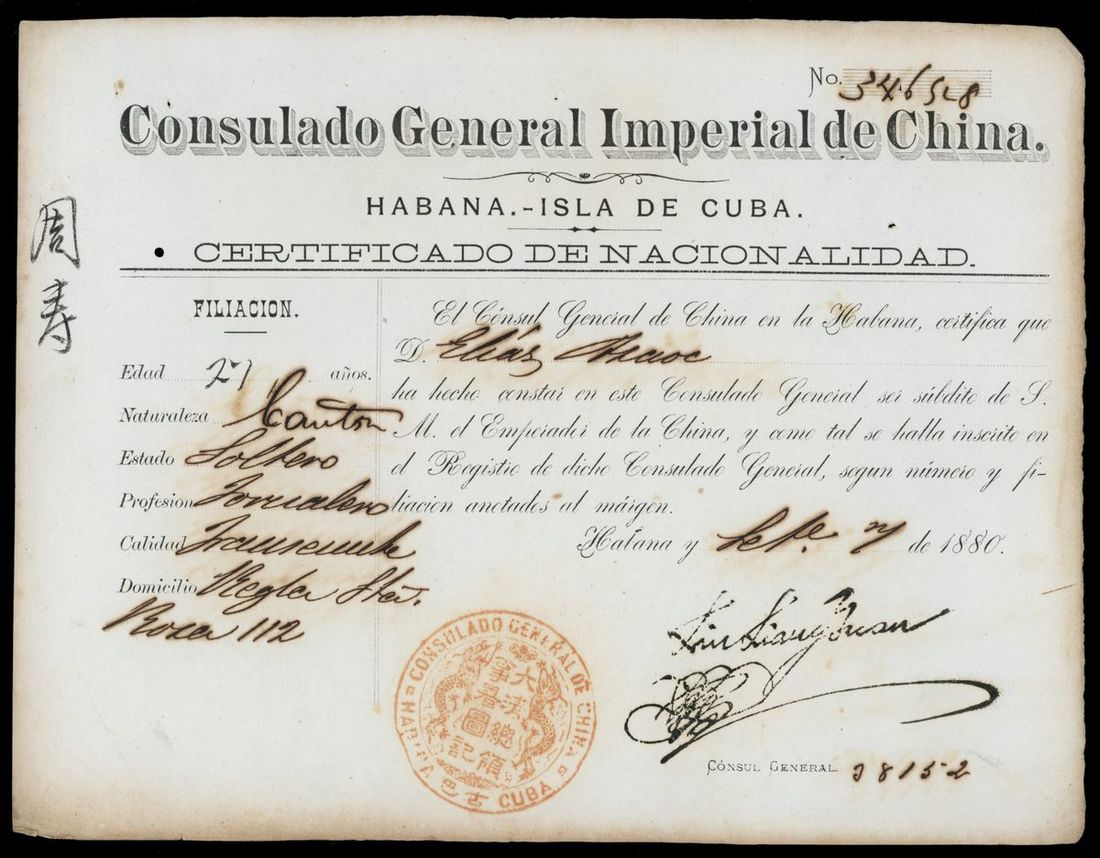 1880 Chinese labour documents of identity for visa, issued by China consulate general in Cuba, twenty-four pieces.