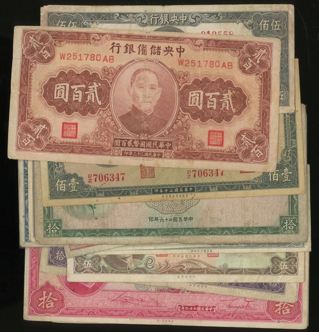 1928-1946 A group of ROC Banknotes, total 11 pcs plus 1961-1994 Taiwan Bank note. Total 5 pcs. Condition average. 12001500