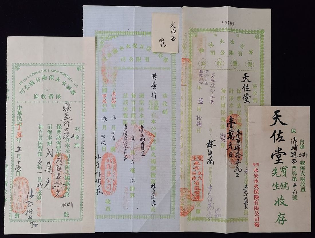 1930s-1940s three types of receipts from Hong Kong insurance companies, including the 1933 Wing On Fire and Water Insurance Co., Ltd. receipt with an envelope.