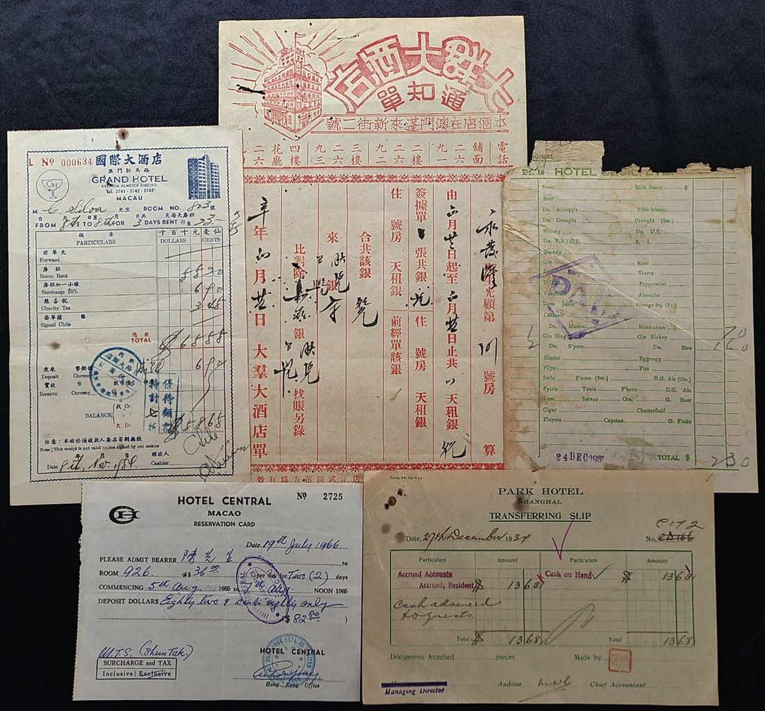 1930s-1960s five hotel receipts in Hong Kong, Macau and Shanghai, including Hong Kong Cecil Hotel, Macau Daqun Hotel, etc.