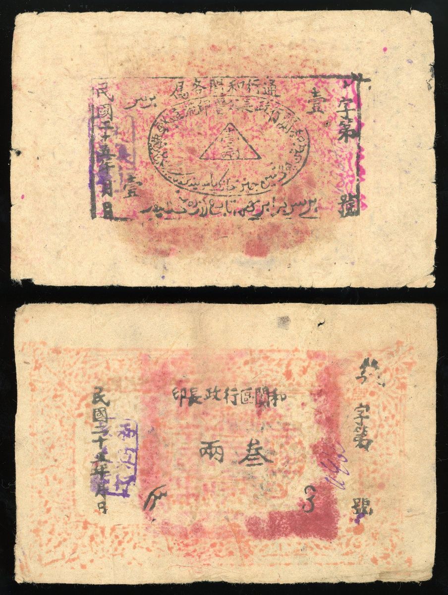 1936 one each of 3-liang one 1-liang banknote in circulation in Khotan, Xinjiang.
