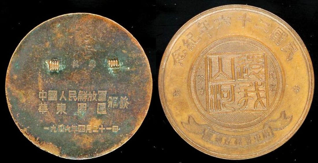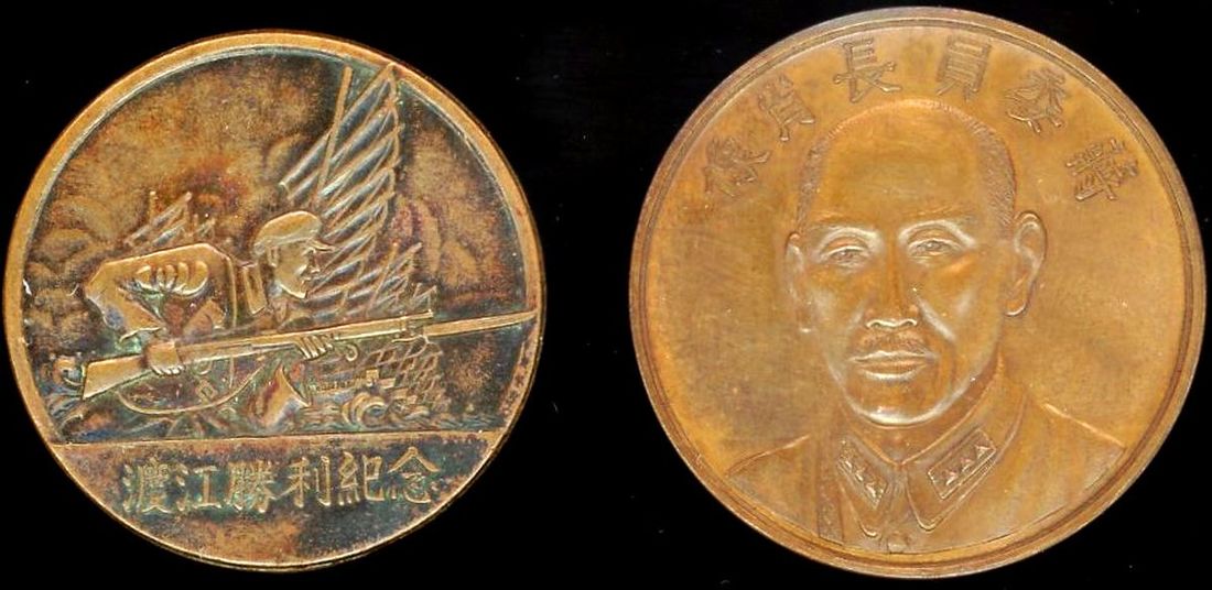 1937 a bronze medallion with the inscription "Return our country to me" (diameter 3.2cm), with Chairman Chiang Kai-shek on the front; The other also a bronze medal commemorating the victory of crossing the Yangtze River in 1949 (diameter: 3cm).
