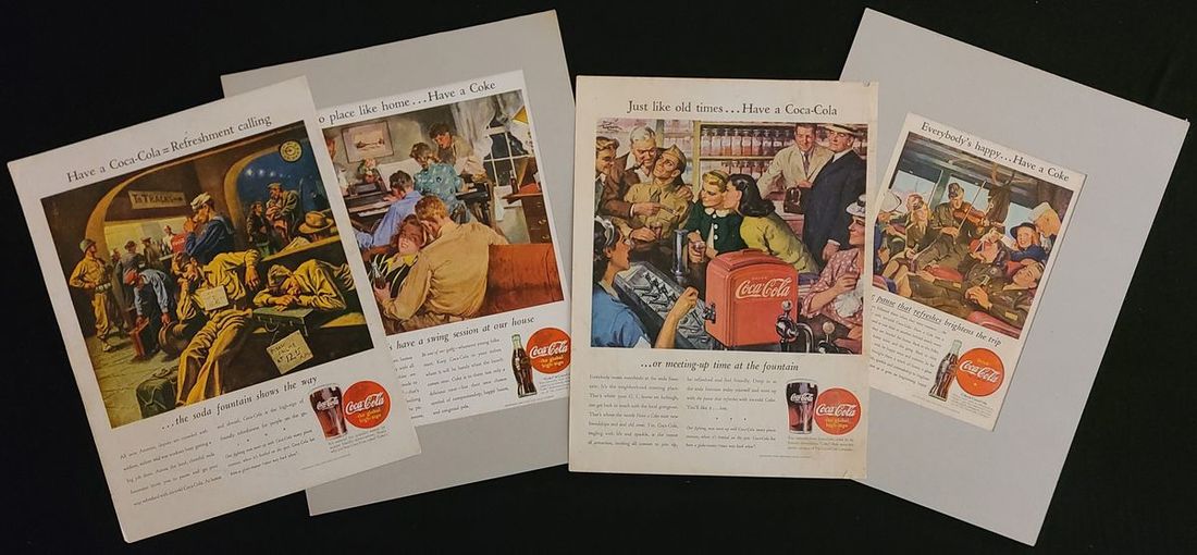 1940s a group of nine Coca-Cola magazine ads, most with the US soldier. They are a little aged, but in good condition. Most of them are framed.