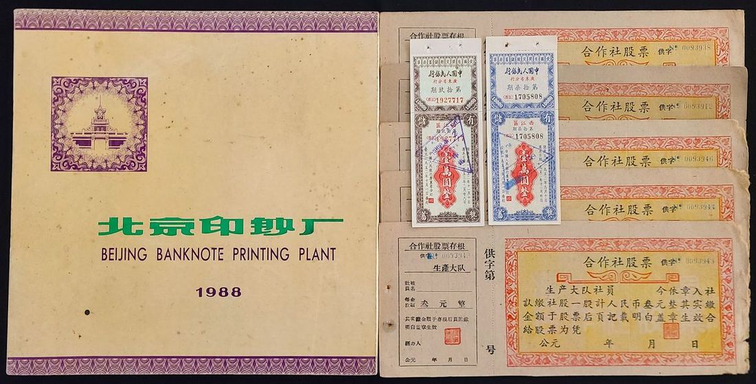 1950年代中國合作社股票五枚, 1952年中國人民銀行廣東省分行的愛國儲蓄存單 (壹萬圓)两枚及1988年北京印鈔廠特刊一册.