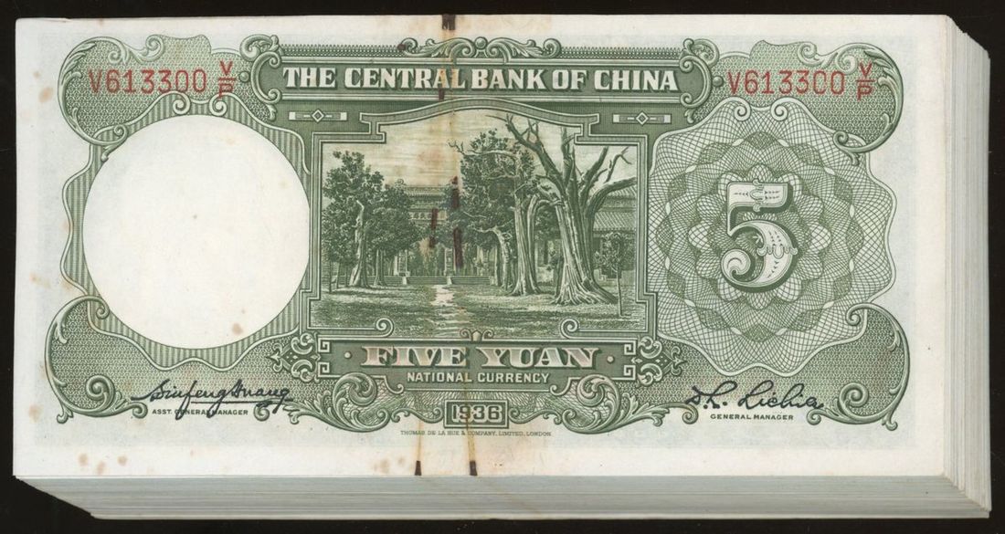 Central Bank of China, consecutive 5 yuan (100), Year 25 (1936), serial numbers V613201-300 V/P, (Pick 213), no major creases, foxing and stain, extremely fine (100) From the descendant of an Overseas Chinese merchant Family.