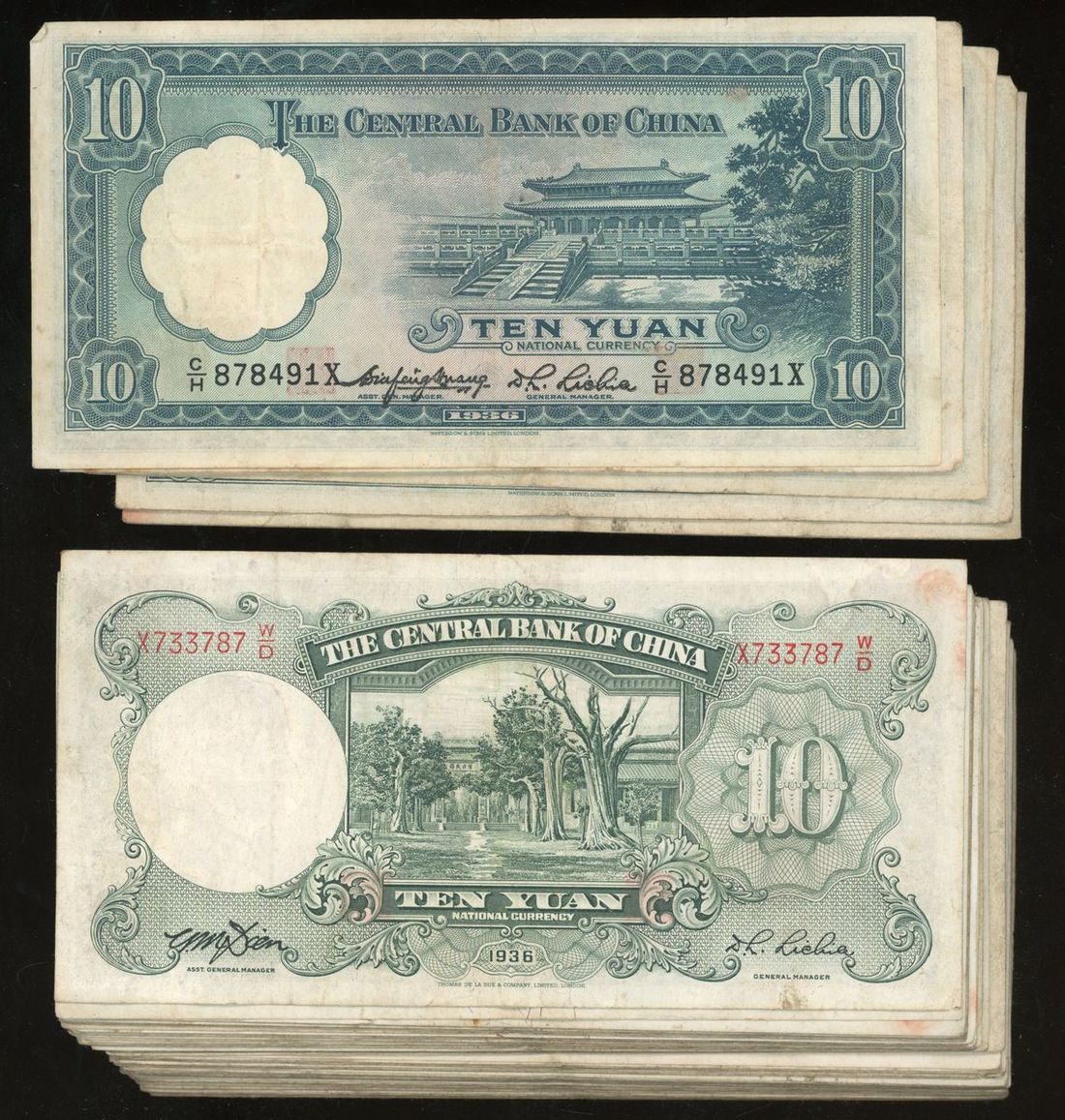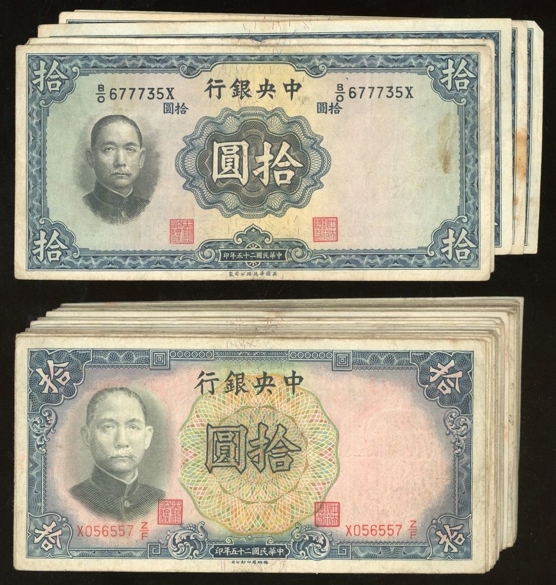Central Bank of China, 10 yuan (55), Year 25 (1936), (Pick 214, 218), fine (55) From the descendant of an Overseas Chinese merchant Family.