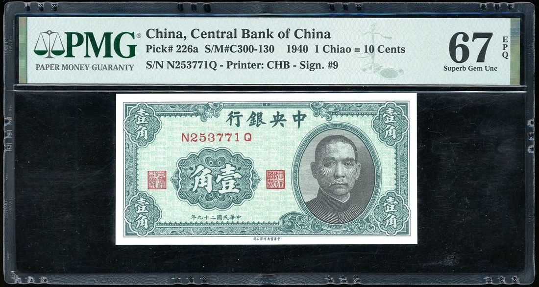 The Central Bank of China, 10 cents, 1940, serial number N 253771 Q, (Pick 226a), PMG 67EPQ Superb Gem Uncirculated. PMG census with only 4 better