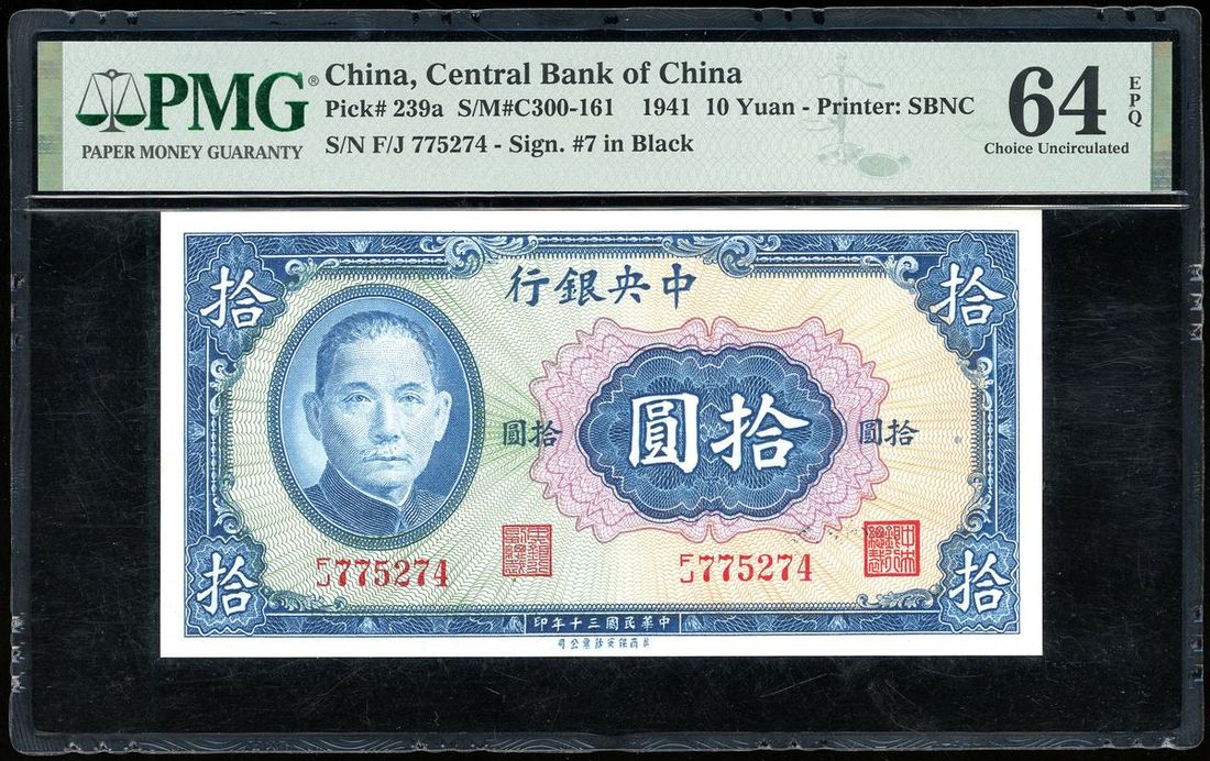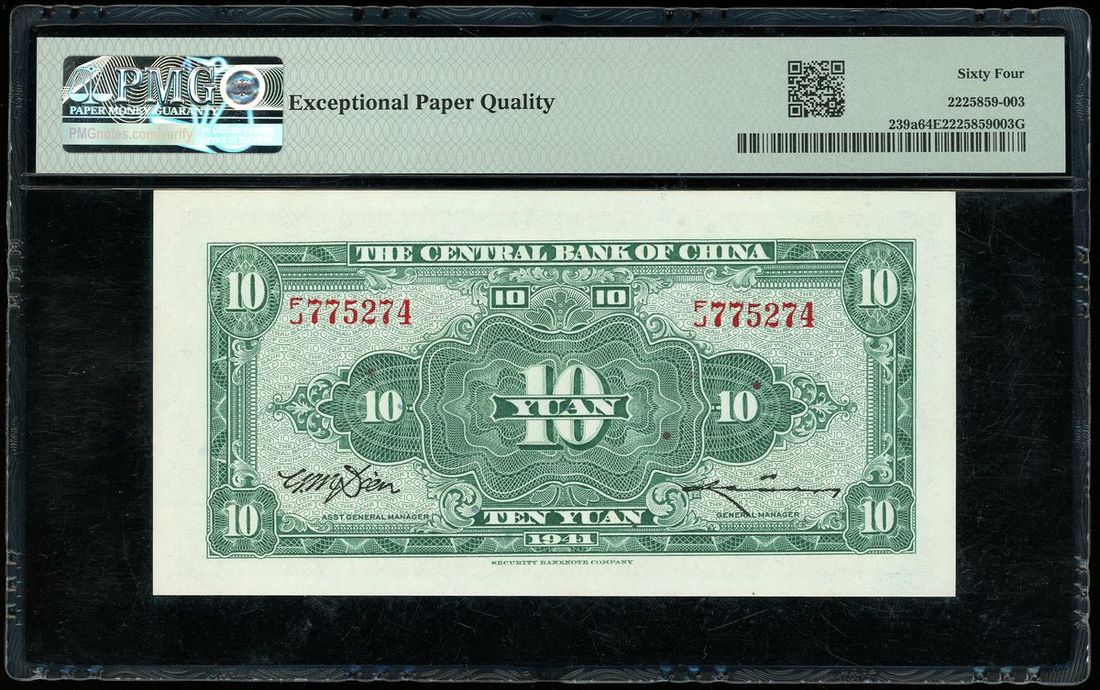 The Central Bank of China, 10 yuan, 1941, serial number F/J 775274, (Pick 239a), PMG 64EPQ Choice Uncirculated