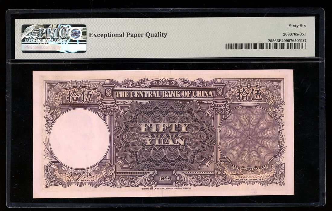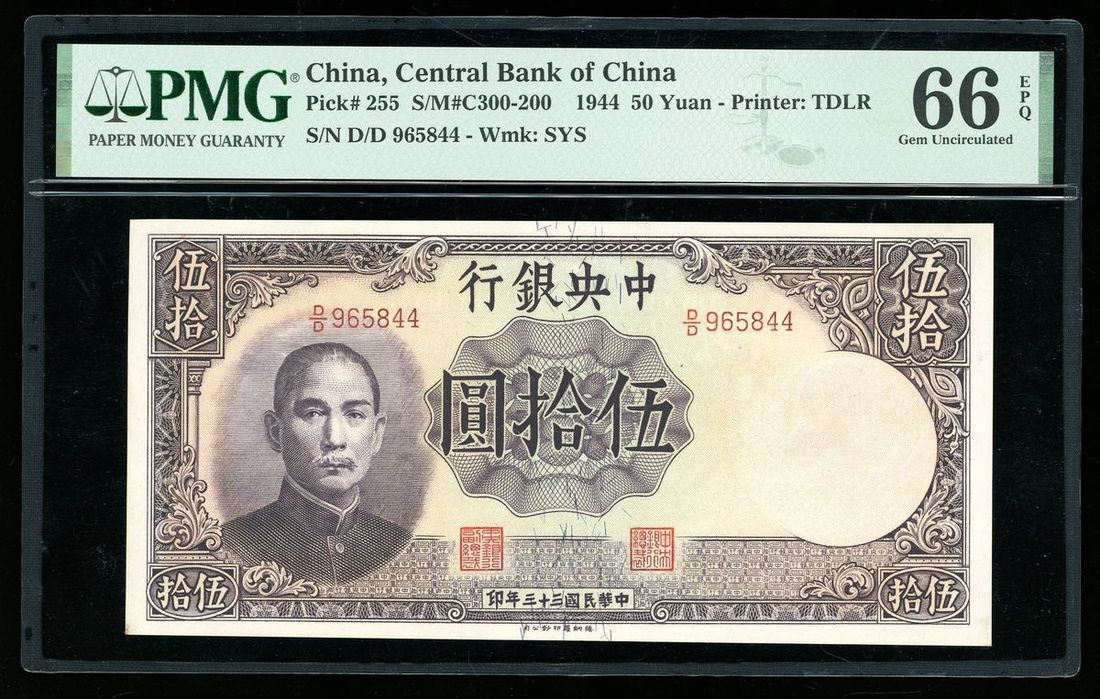 Central Bank of China, 50 yuan, Year 33 (1944), serial number D/D 965844, (Pick 255), PMG 66EPQ