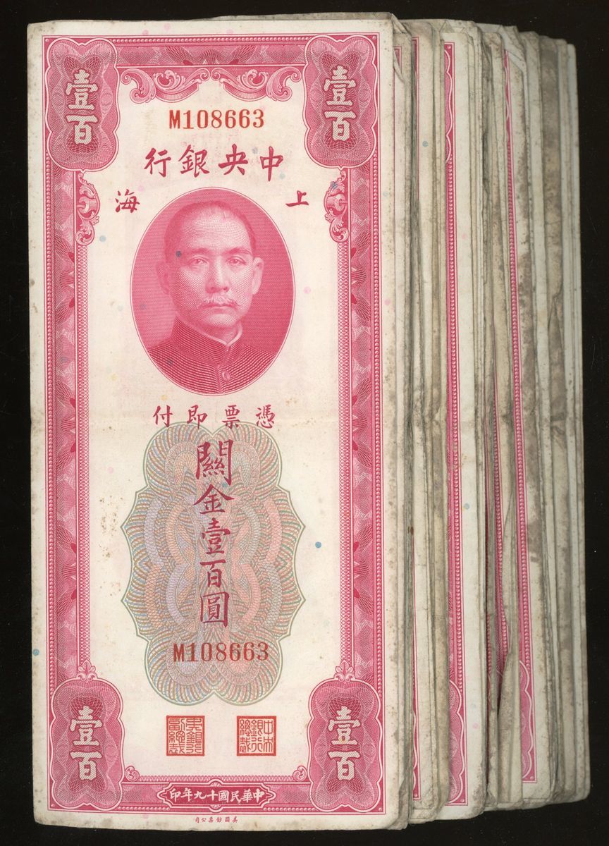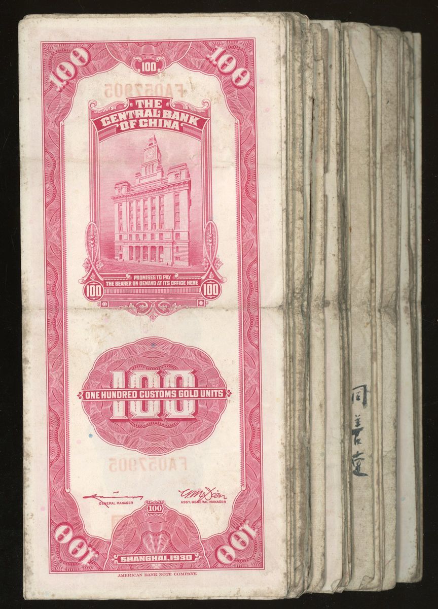 Central Bank of China, 100 customs gold units (57), Year 19 (1930), (Pick 330), some with stains, balance fine to very fine (57) From the descendant of an Overseas Chinese merchant Family.