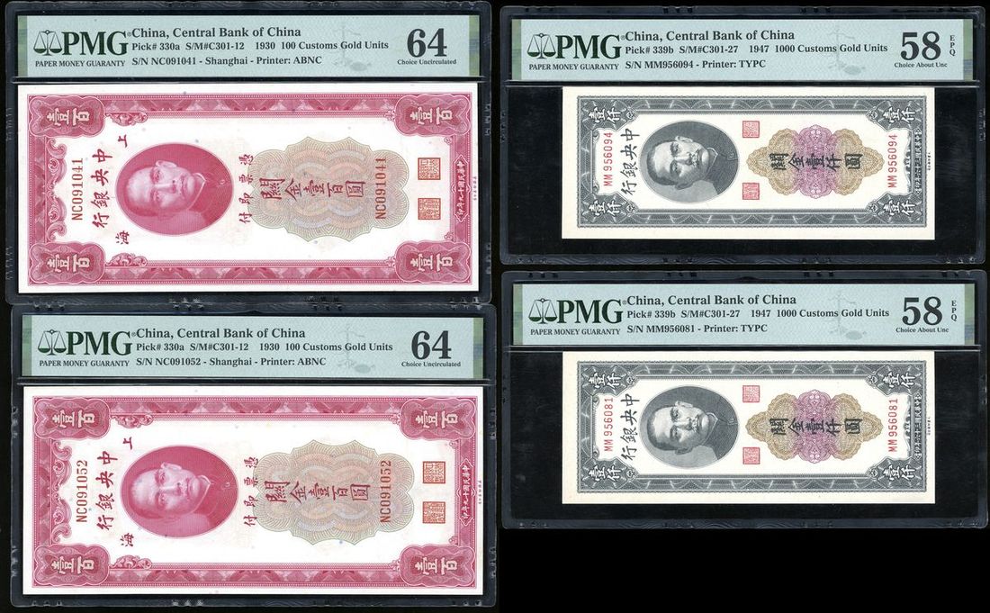 Central Bank of China, a group of 4x, Year 36 (1947) 1000 Custom Gold Units (2) and 1930 Shanghai 100 Custom Gold Units (2), serial numbers MM 956081, MM 956094, NC 091041 and NC 091052,