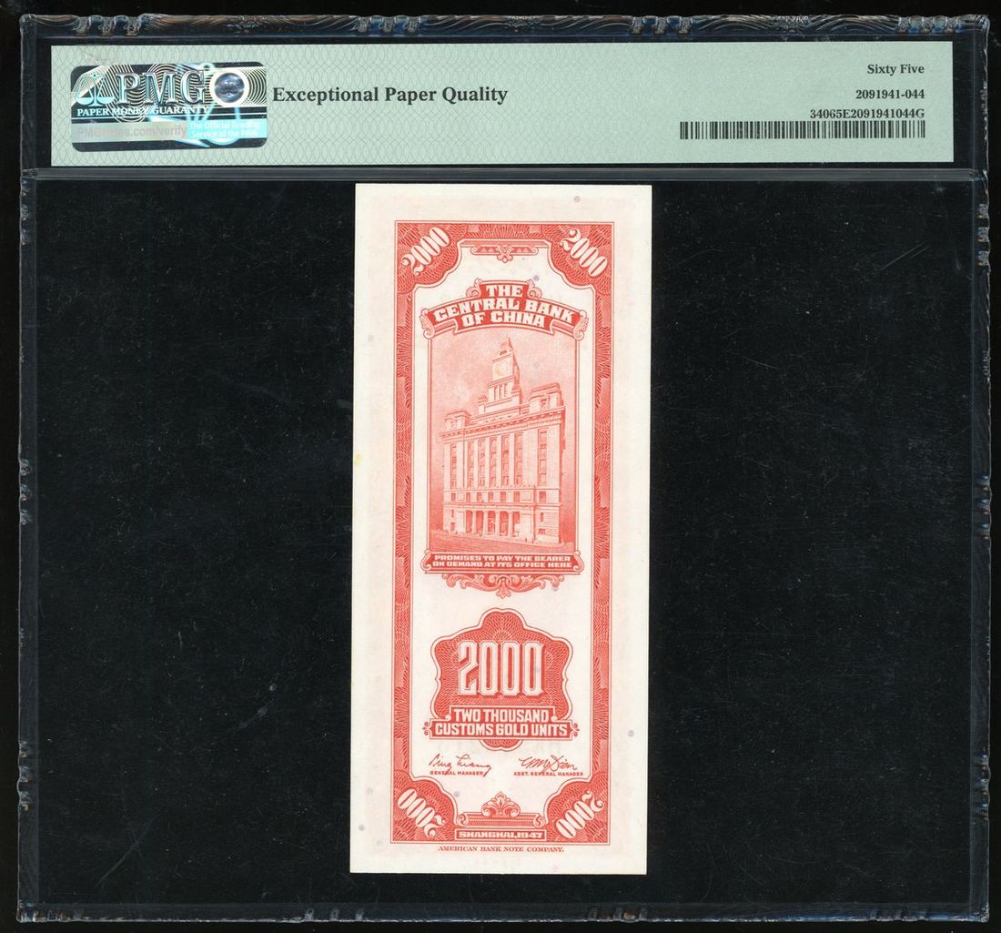 Central Bank of China, 2000 customs gold units, Year 36 (1947), serial number HK545213, (Pick 340), PMG 65EPQ