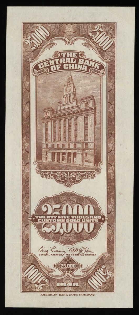 Central Bank of China, 25000 customs gold units, 1948, serial number B588658, vertical format, brown and multicolour vignette, portrait of Sun Yat Sen at top centre,
