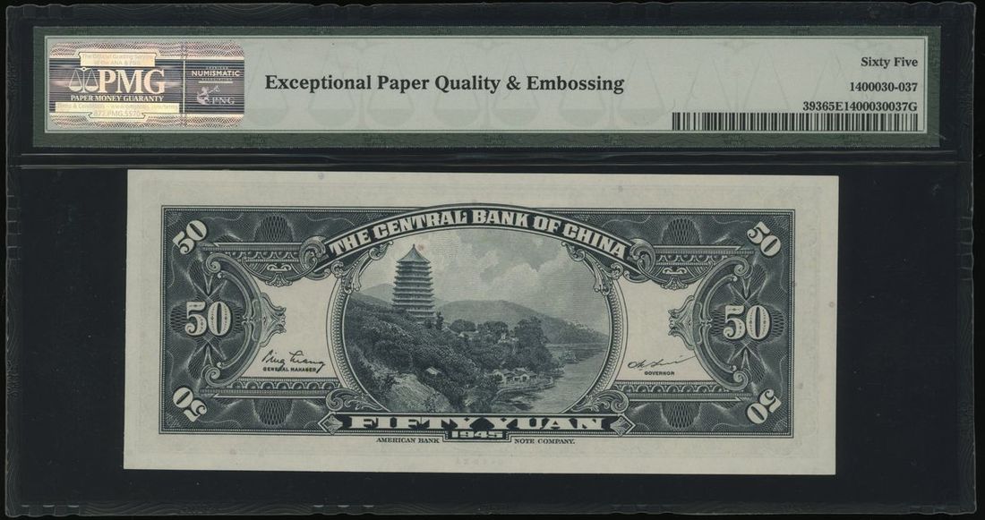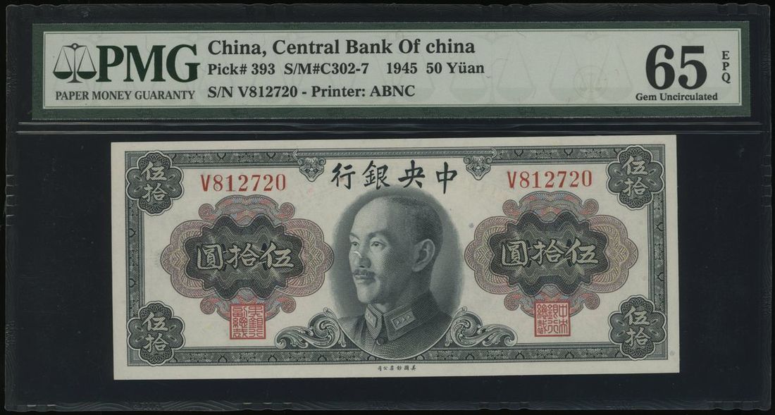 The Central Bank of China, 50 yuan, 1945, serial number V 812720, (Pick 393), PMG 65EPQ. The 4th highest grade in the PMG population report