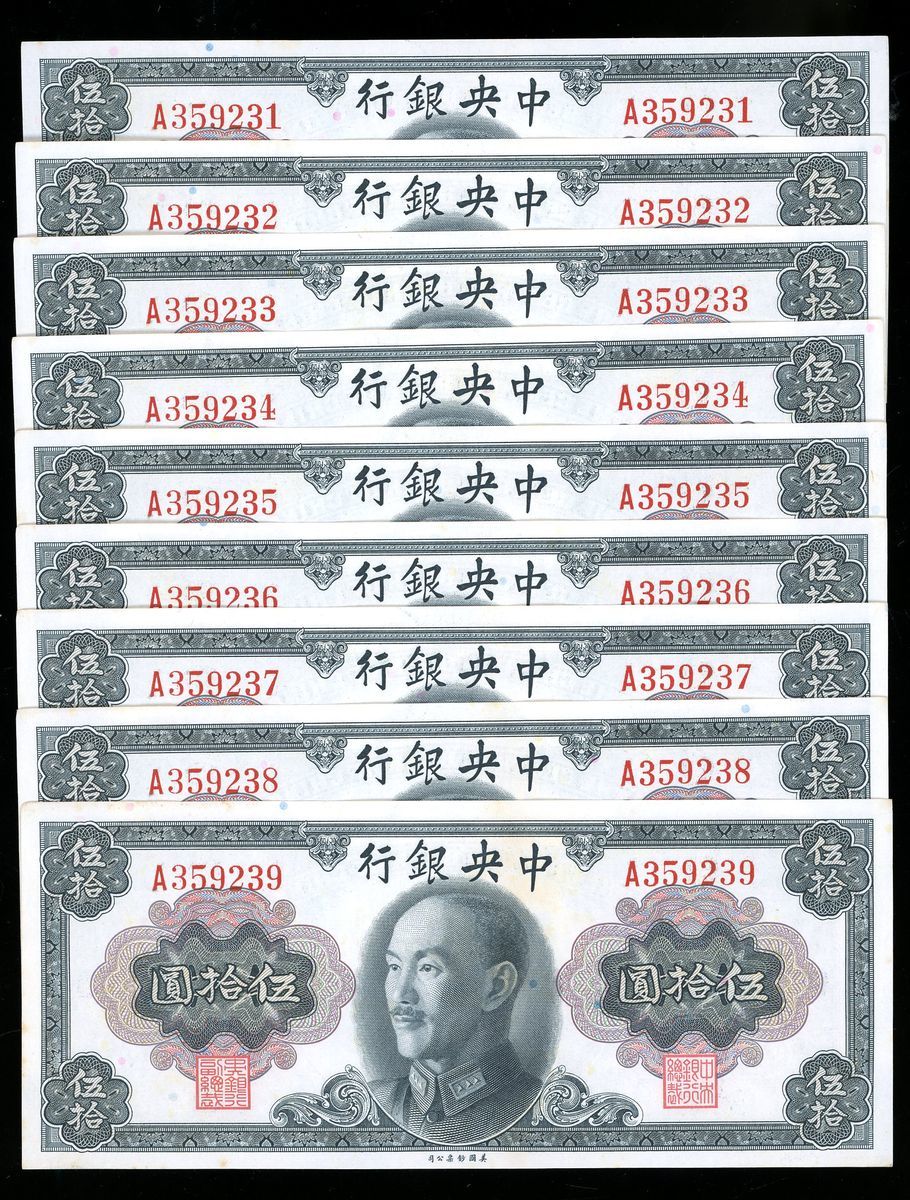 Central Bank of China, consecutive 50 yuan (9), 1945, serial numbers A359231-39, printed by ABNC,
