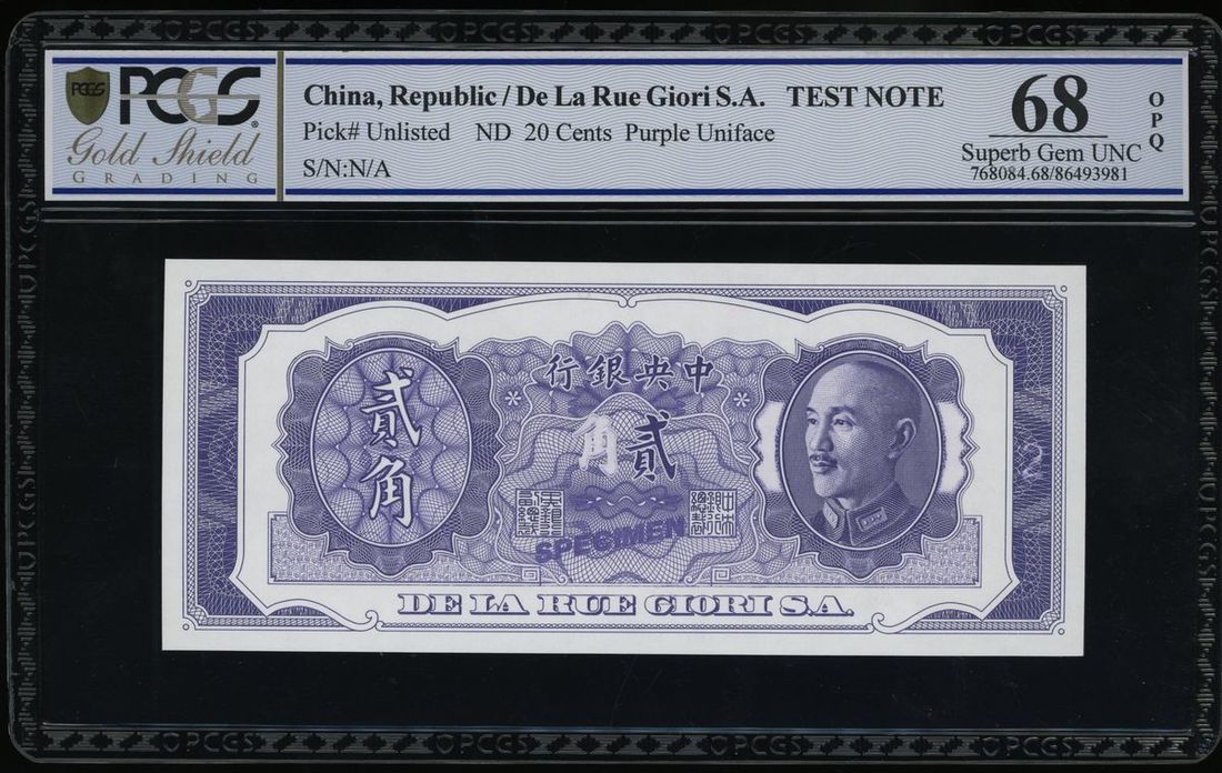 Central Bank of China, uniface 20 cents test note printed by De La Rue Giori S.A., ND, purple, portrait of Chiang Kai Shek at right,
