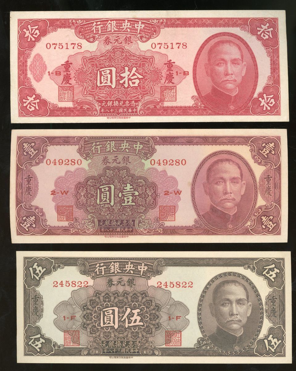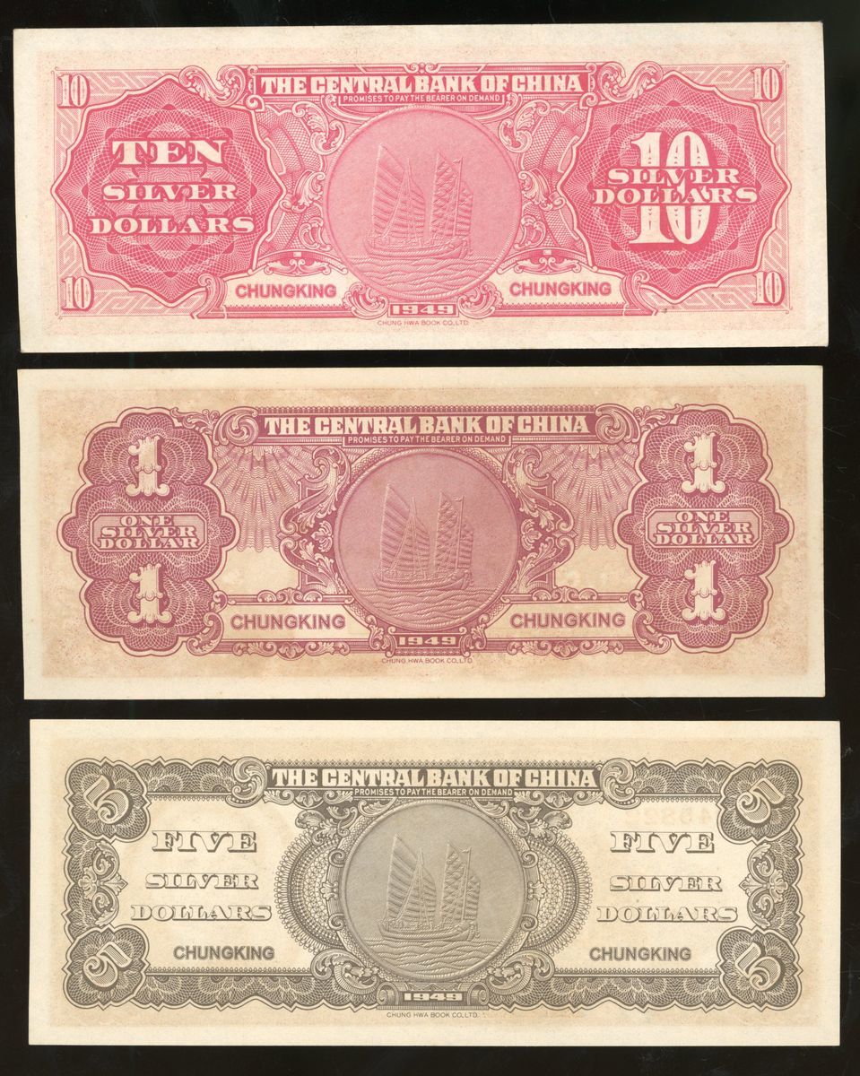 Central Bank of China, a group of 3x, Year 38 (1949), including 1, 5 and 10 silver dollars, Chungking, (Pick 440, 443, 446), about uncirculated (3)