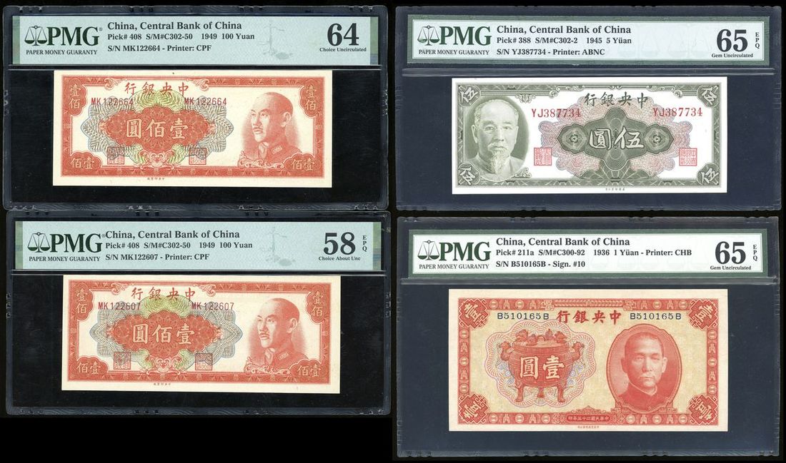 Central Bank of China, a group of 4x, including: 1936 1 yuan, 1945 5 yuan and a pair of 1949 100 yuan, serial numbers B 510165 B, YJ 387734 and MK 122607/664,