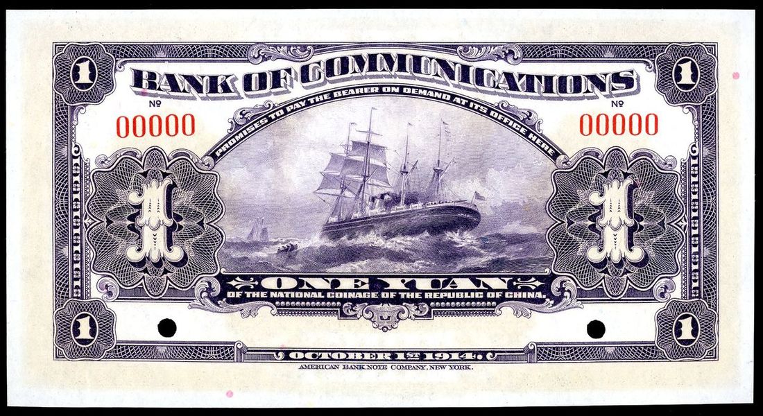 民國三年交通銀行壹圓樣票,編號00000,紫色,UNC品相