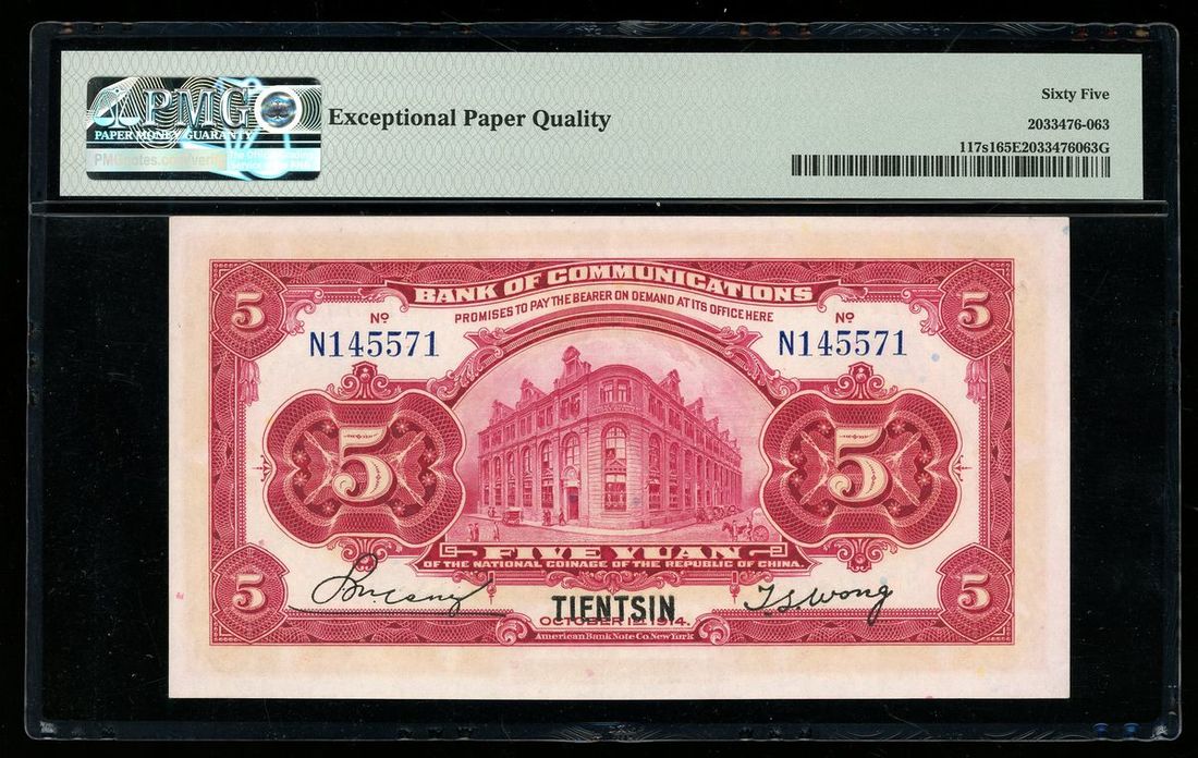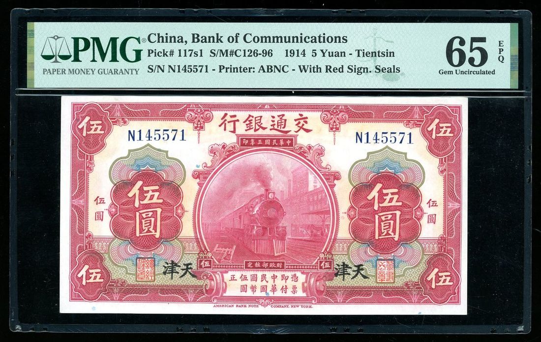 Bank of Communications, China, 5 yuan, Year 3 (1914), Tientsin, serial number N145571, (Pick 117s1), PMG 65EPQ