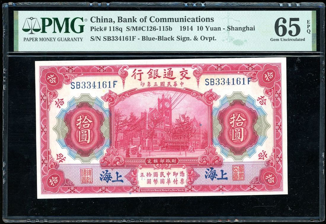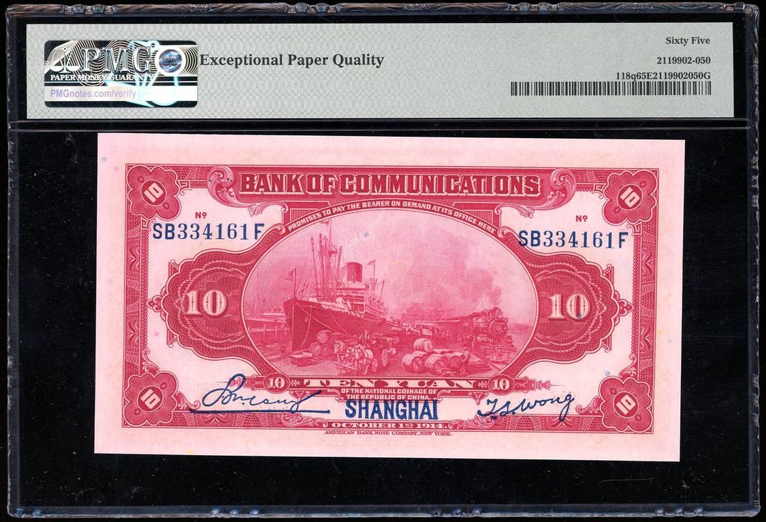 Bank of Communications, China, 10 yuan, Year 3 (1914), Shanghai, serial number SB 334161 F, (Pick 118q), PMG 65EPQ Gem Uncirculated