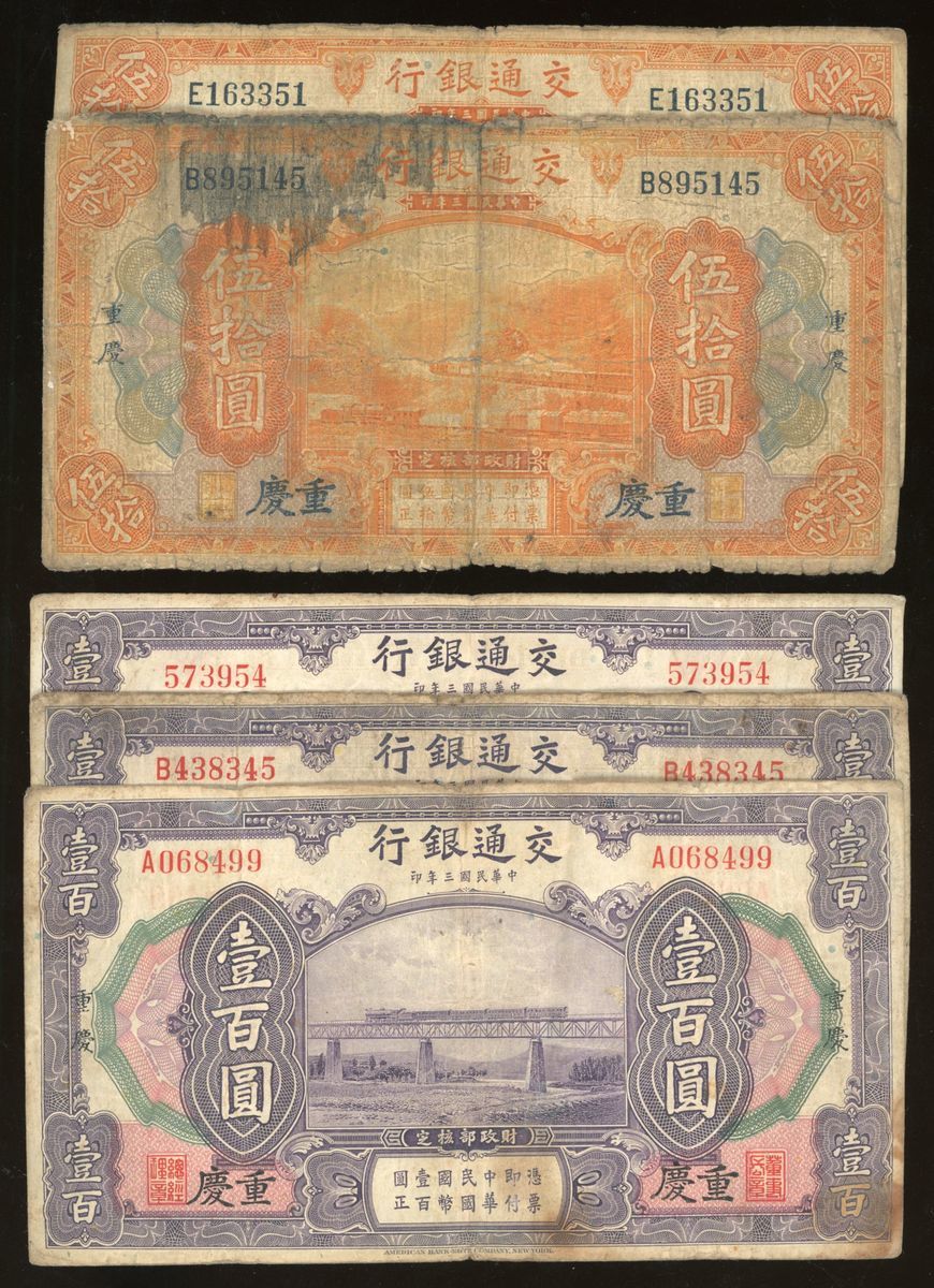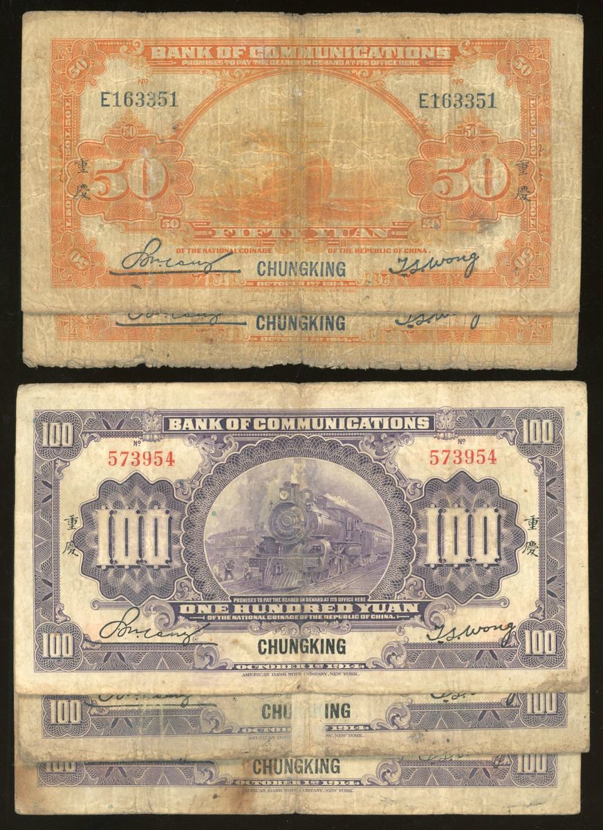 Bank of Communications, China, a group of 5x, including 50 and 100 yuan, Chungking, (Pick 119, 120), very good to very fine (5) From the descendant of an Overseas Chinese merchant Family.