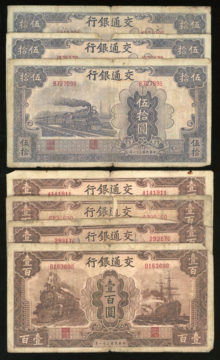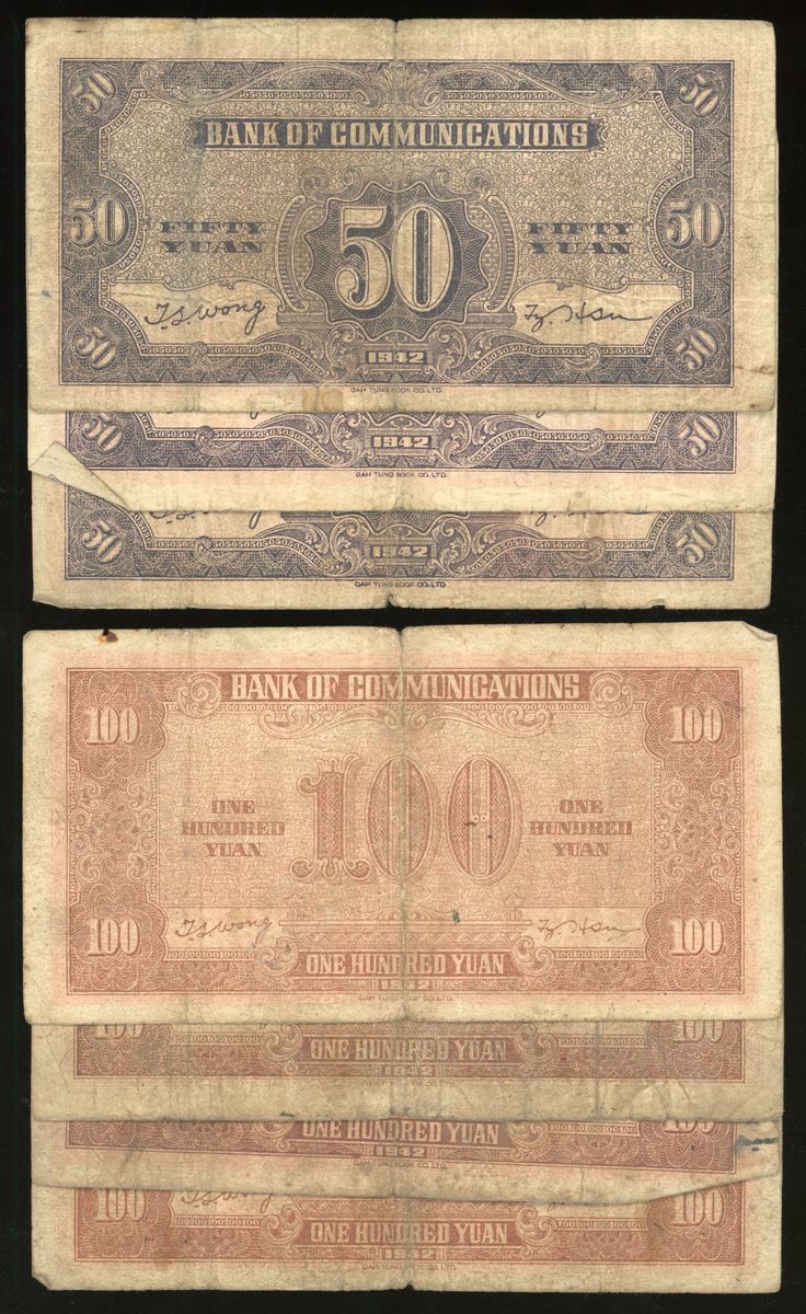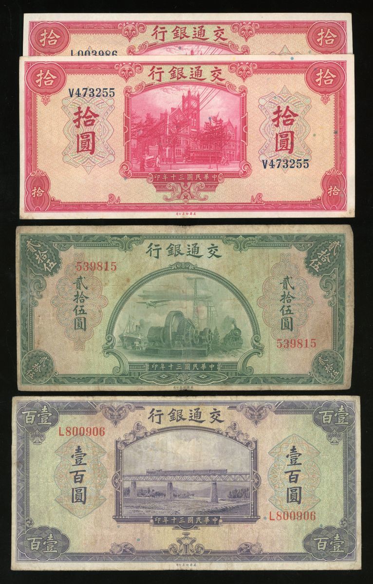 Bank of Communications, China, a group of 11x, including, Year 30 (1941), including 10 yuan (2), 25 yuan and 100 yuan, and Year 31 (1942), including 50 yuan (3) and 100 yuan (4),