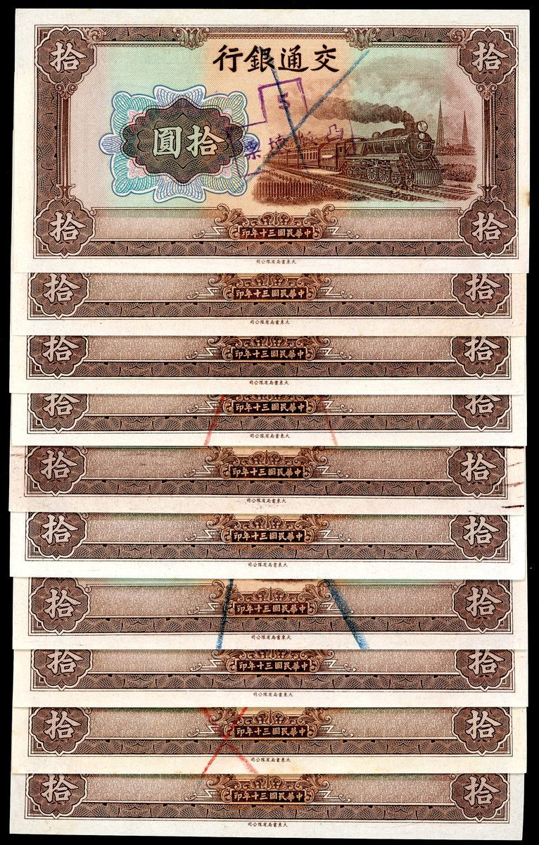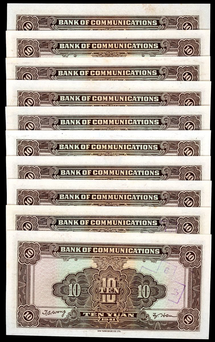 Bank of Communications, China, ERROR 10 yuan (10), Year 30 (1941), all with missing serial numbers and signature chops, (Pick 159), some with overprints and annotations, minor foxing at margin, balance uncirculated (10)