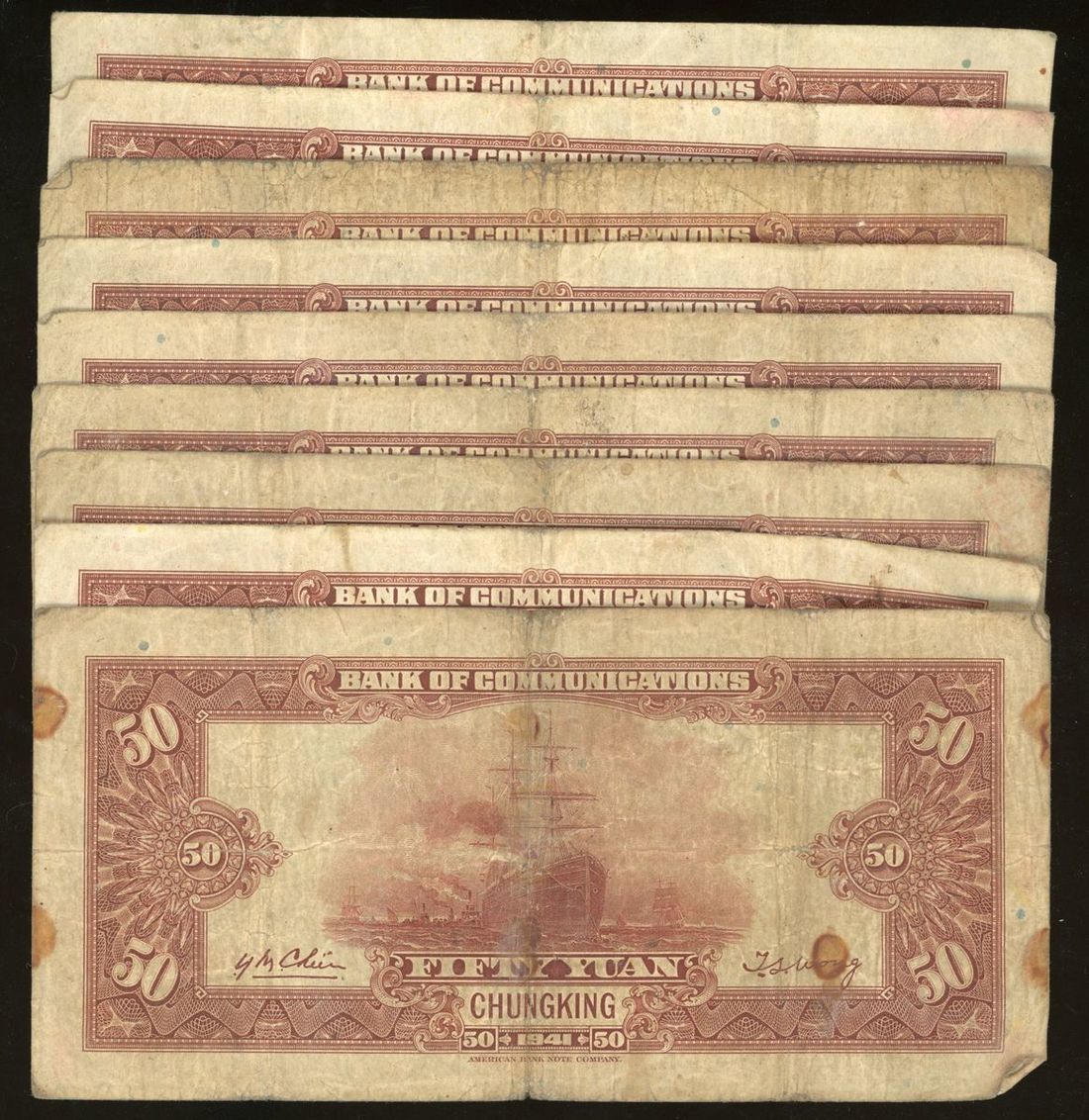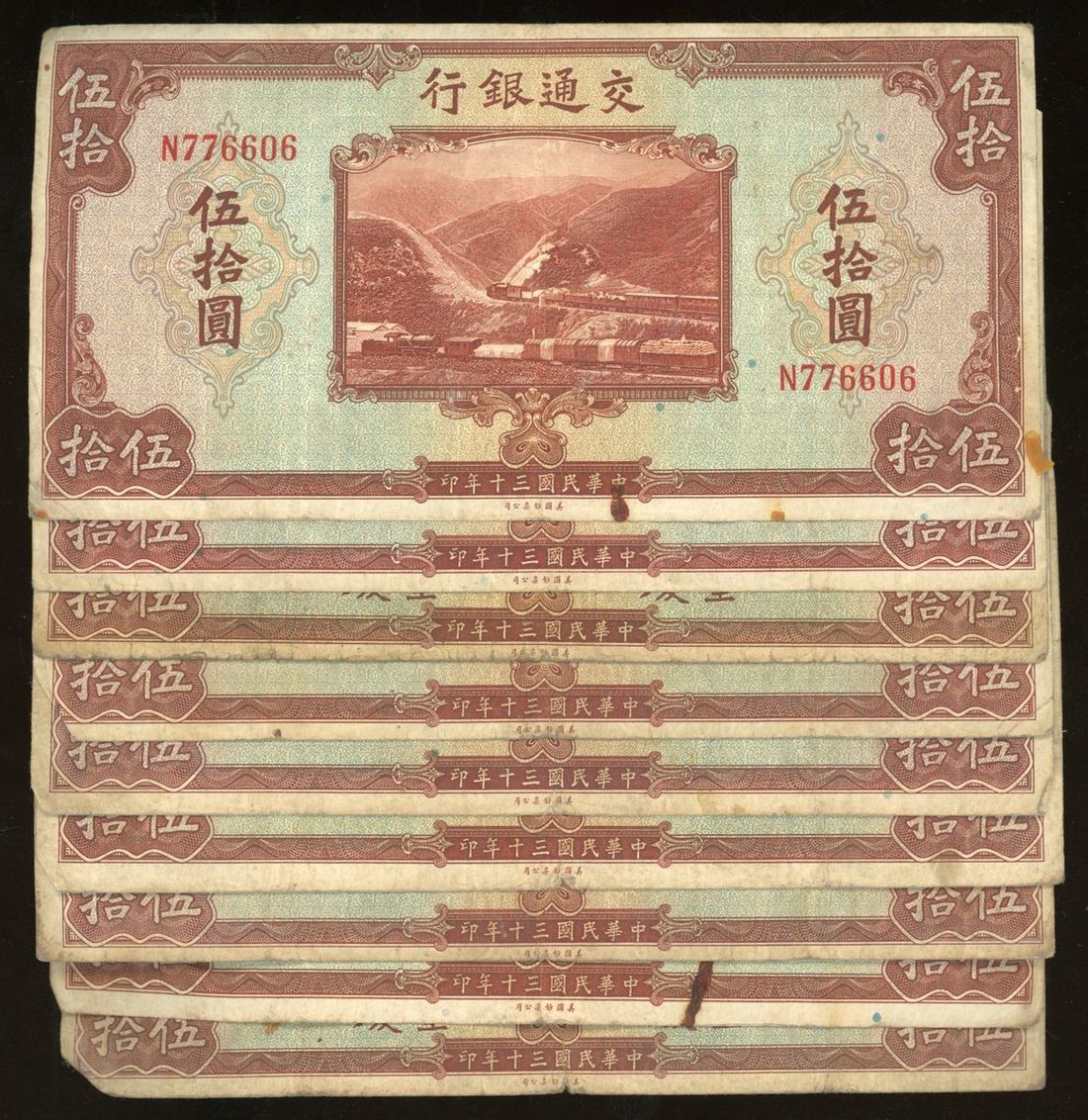 Bank of Communications, China, 50 yuan (9), Year 30 (1941), some with Chungking overprint, (Pick 161), generally fine (9) From the descendant of an Overseas Chinese merchant Family.