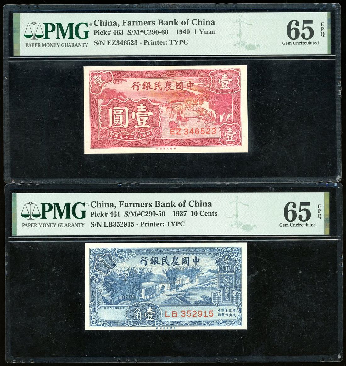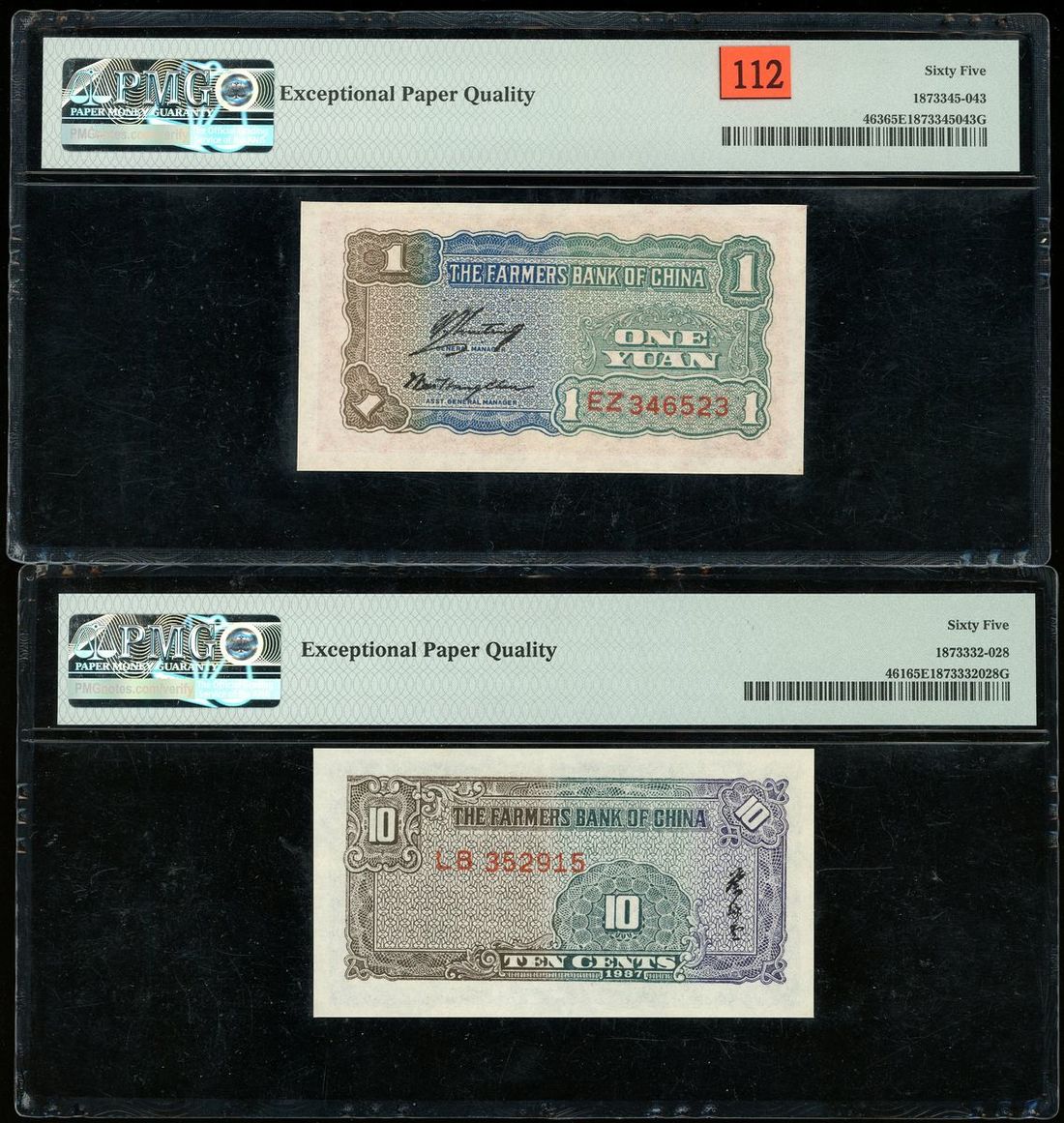 The Farmers Bank of China, 10 cents and 1 yuan, 1937 and Year 29 (1940), serial numbers LB 352915 and EZ 346523,