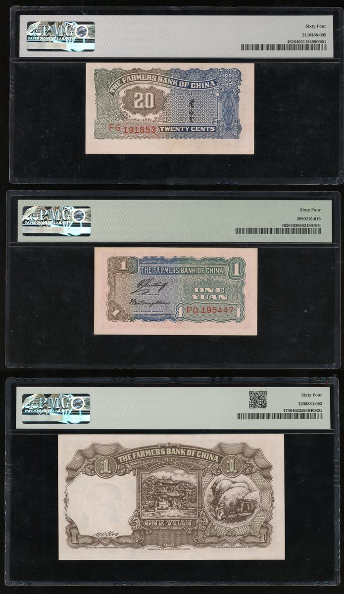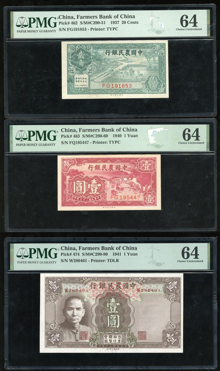 Farmers Bank of China, a group of 3x, including: 20 cents (1937), 1 Yuan (1940), 1 Yuan (1941), serial numbers FG191853, FQ195447, W280461 respectively, (Pick 462, 463, 474)