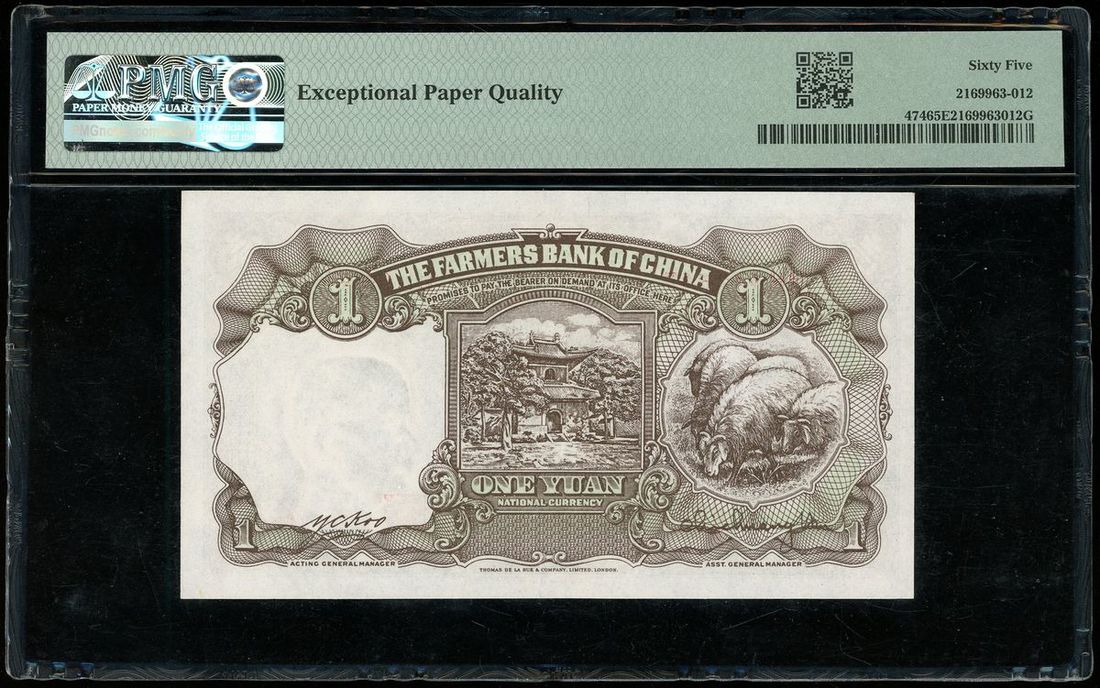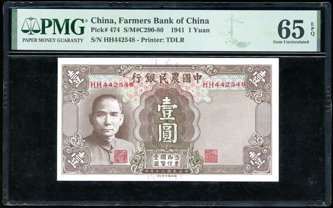 Farmers Bank of China, 1 yuan, Year 30 (1941), serial number HH 442548, (Pick 474), PMG 65EPQ Gem Uncirculated
