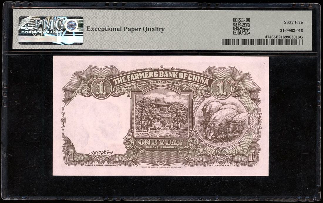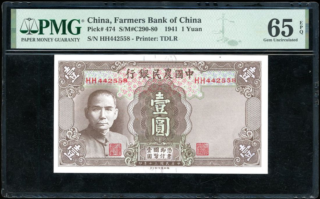 Farmers Bank of China, 1 yuan, Year 30 (1941), serial number HH 442558, (Pick 474), PMG 65EPQ Gem Uncirculated