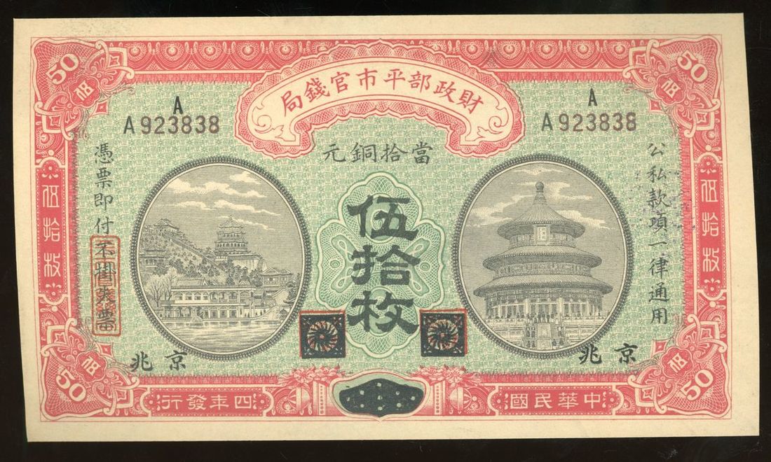 Market Stabilization Monetary Bureau, China, 50 copper coins, JingZhao, Year 4 (1915), serial number A923838, (Pick 602), uncirculated