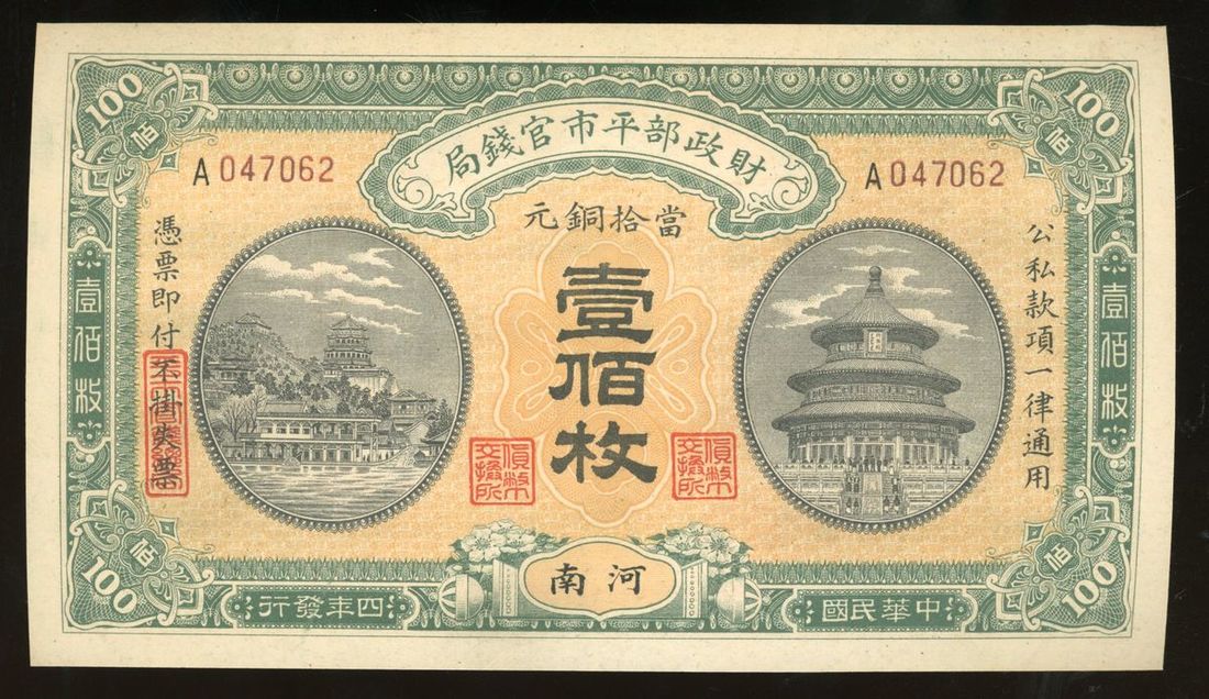 Market Stabilization Monetary Bureau, China, 100 copper coins, Honan, Year 4 (1915), including A047062, (Pick 603e), one light centre fold, about uncirculated