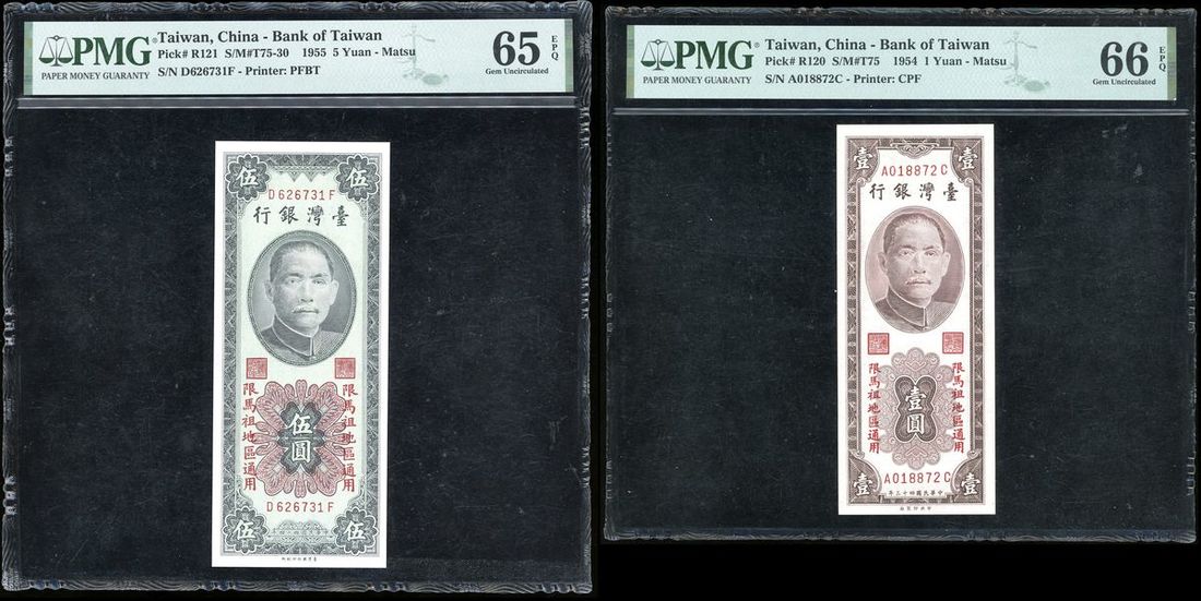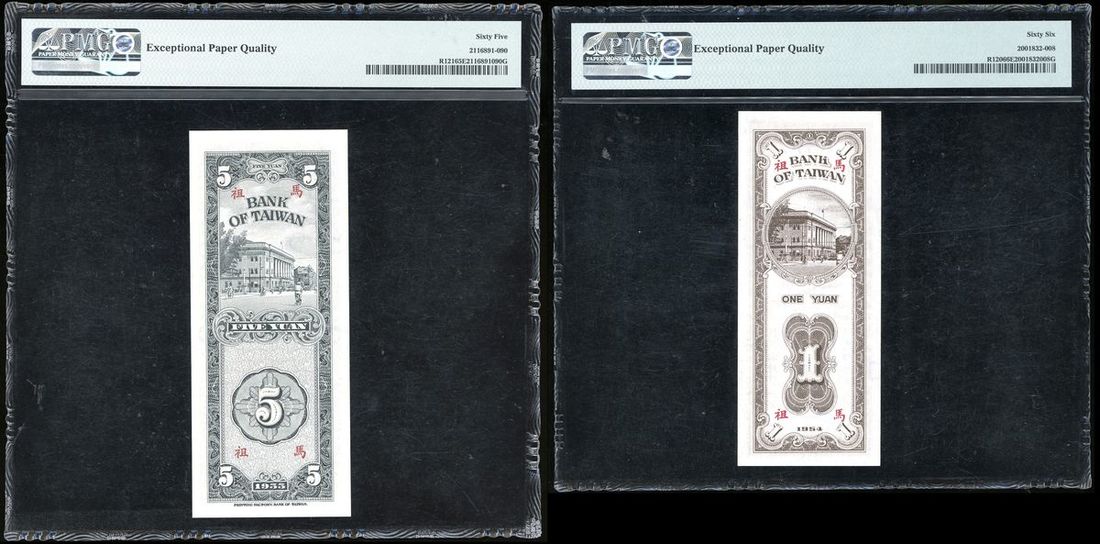 台灣銀行限馬祖地區通用1954年壹圓及1955年伍圓一組2枚,編號 A 018872 C 及 D 626731 F,分別評級為PMG 66EPQ及65EPQ