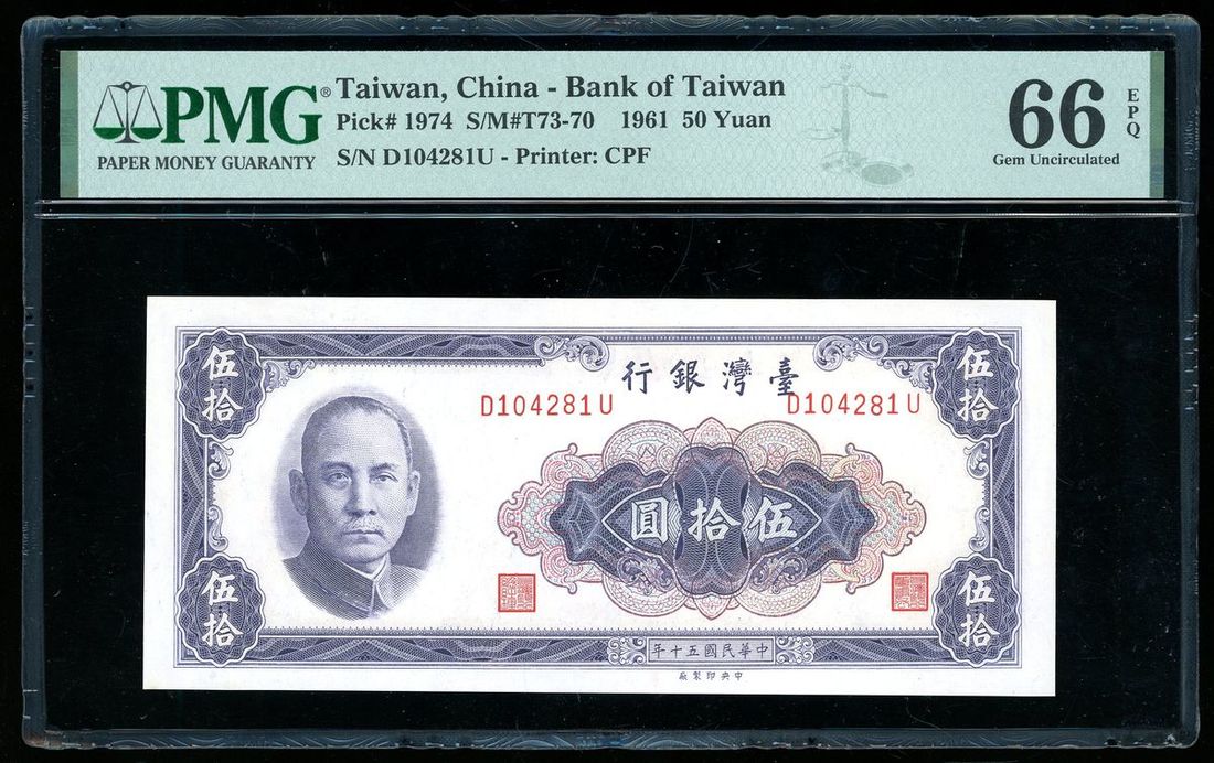Bank of Taiwan, 50 yuan, Year 50 (1961), serial number D104281U, (Pick 1974), PMG 66EPQ