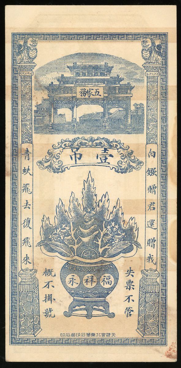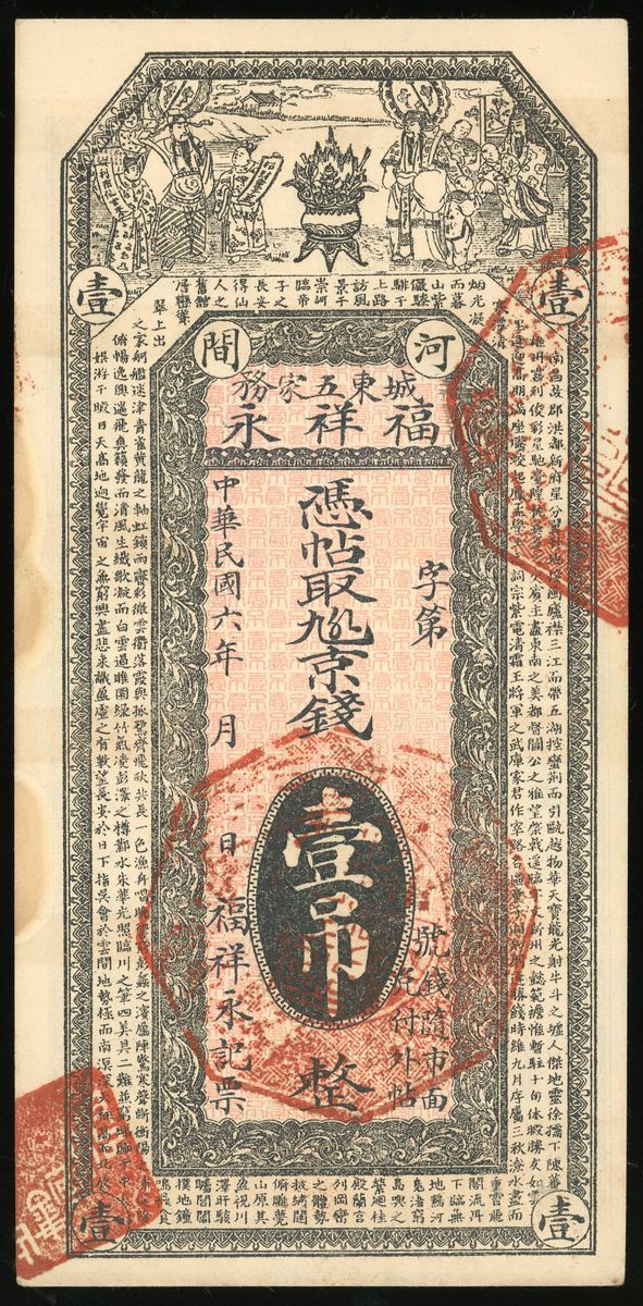 Fu Xiang Yong, Private Issue, China, remainder 1 tao, Year 6 (1917), no serial number, (Pick unlisted), about uncirculated. Interesting with the red chops despite being remainder