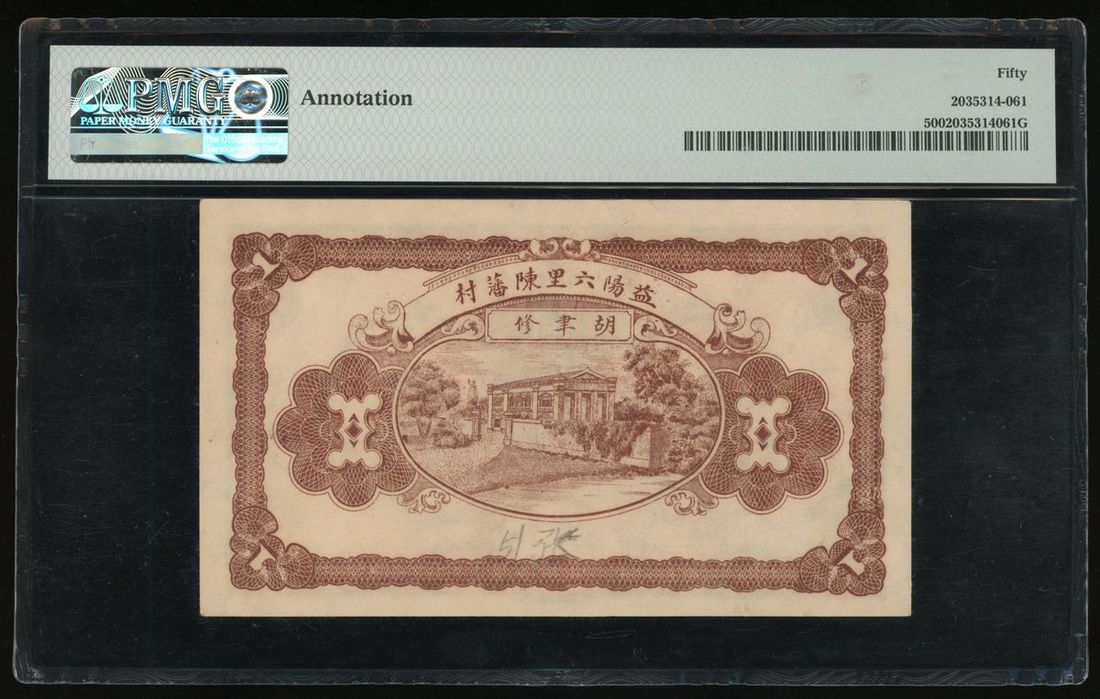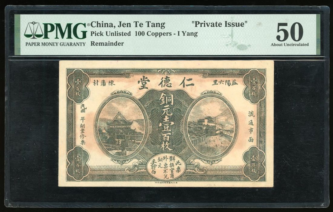 Jen Te Tang, Hunan, Private Issue, China, remainder 100 coppers, I Yang, (Pick unlisted), PMG 50, annotation on reverse.