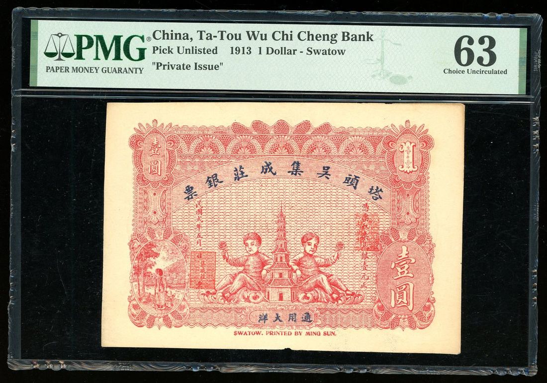 Ta-Tou Wu Chi Cheng Bank, Private Issue, China, $1, Year 2 (1913), Swatow, (Pick Unlisted), PMG 63 Choice Uncirculated