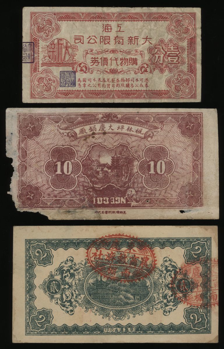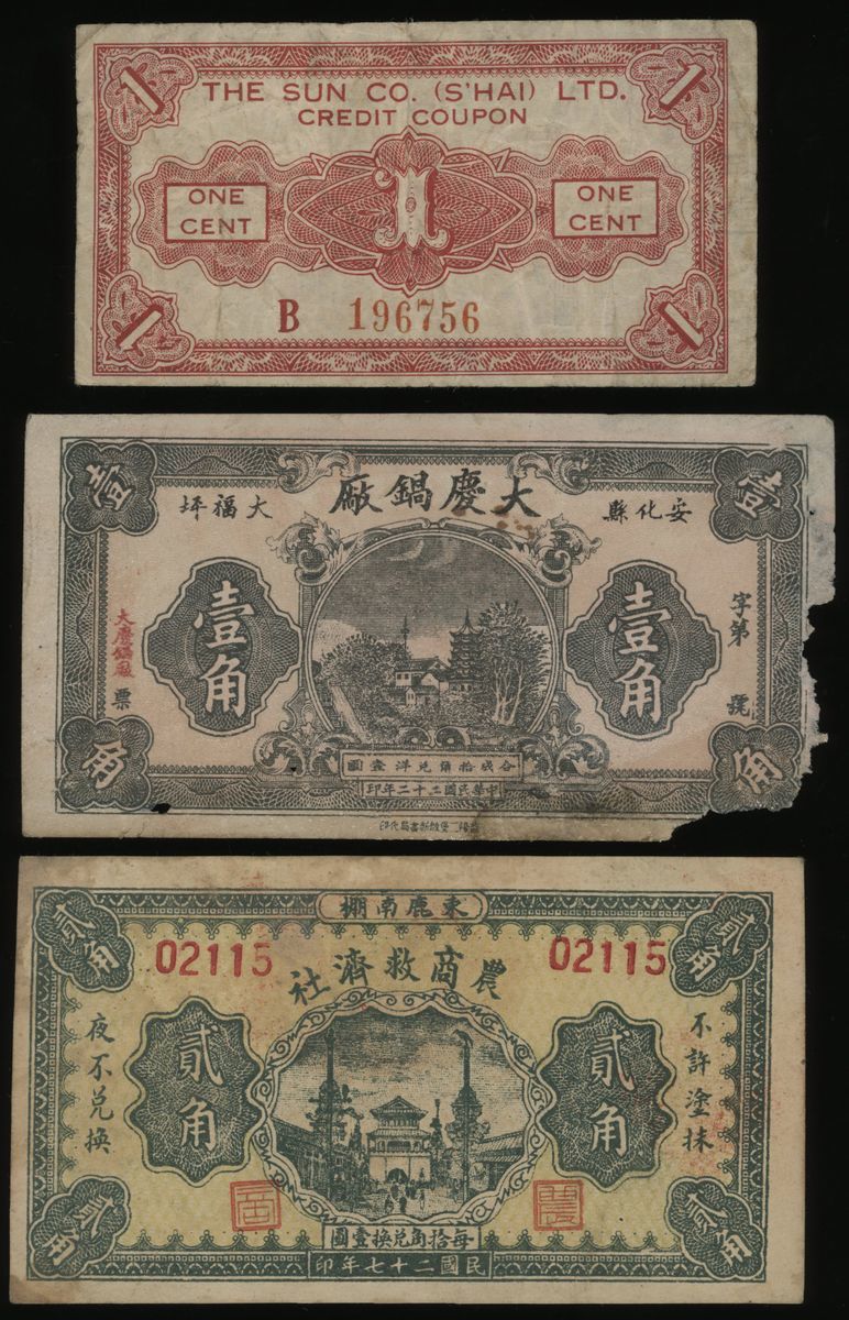 Republic of China, a group of 3 mixed coupons, The Sun Co. (S'Hai) Ltd. Credit Coupon, 1 cent, B196756, Da Qing Pot Factory, 10 cents, 1933, no serial number,