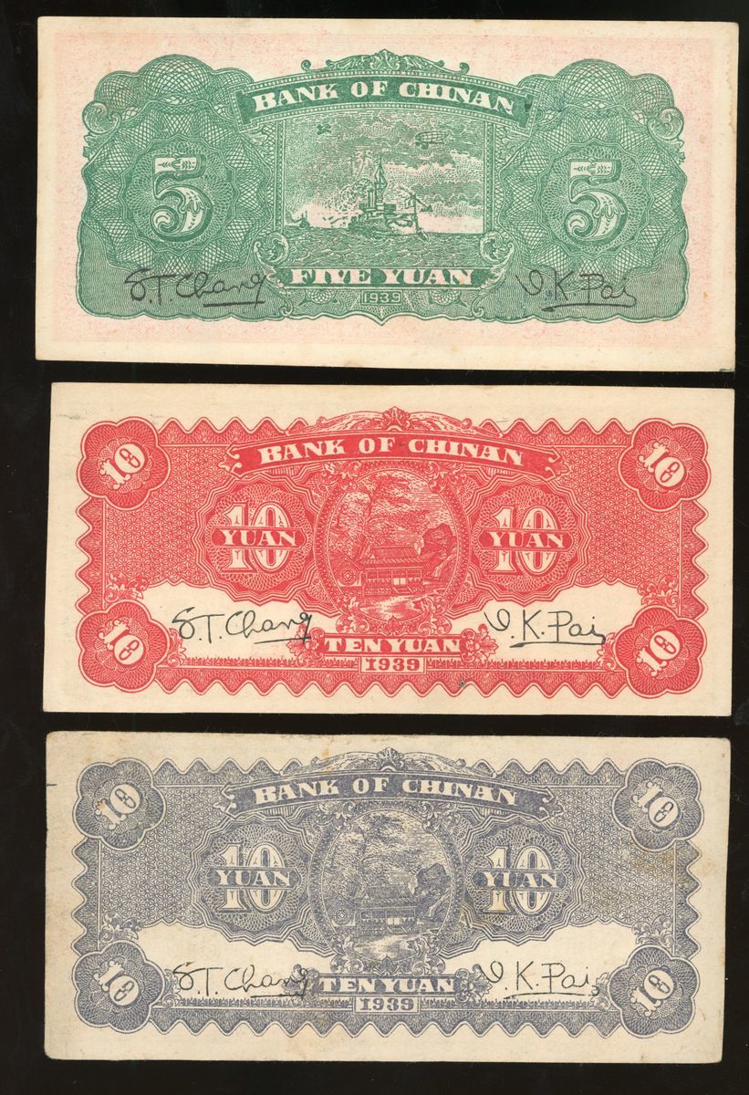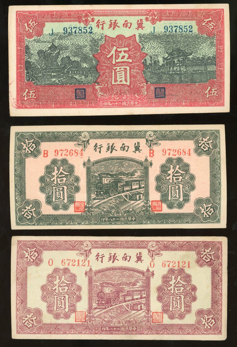 Bank of Chinan, China, a group of 3x, Year 28 (1939), including 5 and 10 (2) yuan, (Pick S3069C, E, S3070), foxing at margin, lightly pressed, about uncirculated (3)