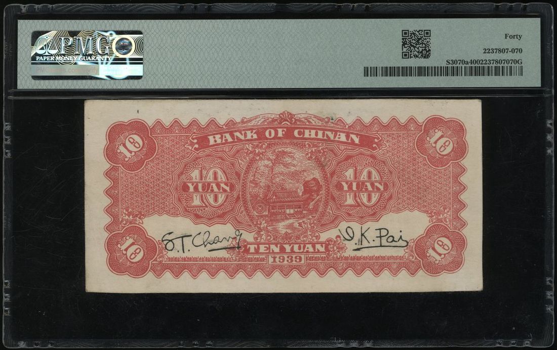 民國二十八年中國銀行拾圓,編號A438925,PMG 40,首字軌