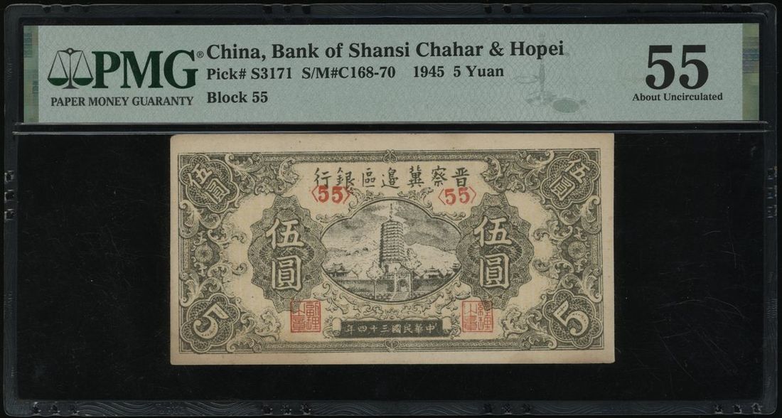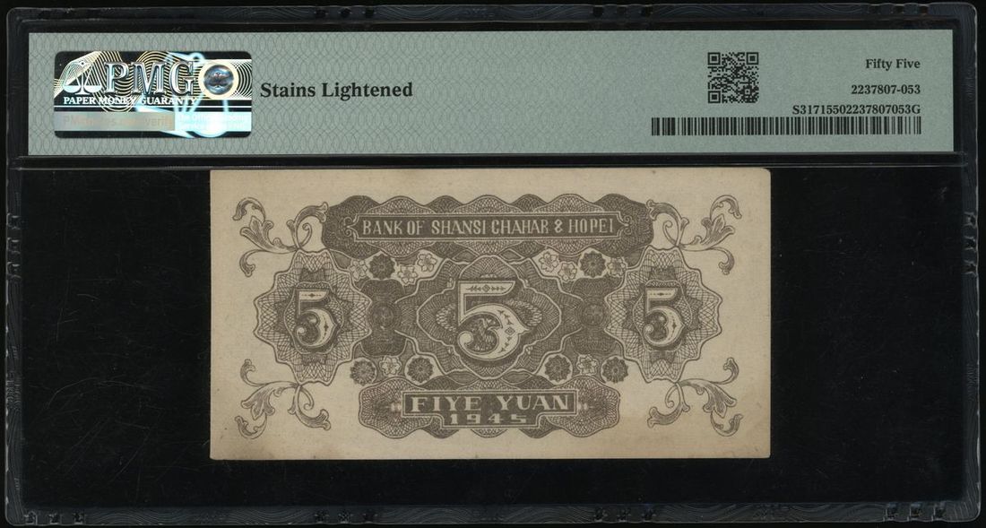 Bank of Shansi Chahar & Hopei, China, 5 yuan, Year 34 (1945), block 55, (Pick S3711), PMG 55, stains lightened