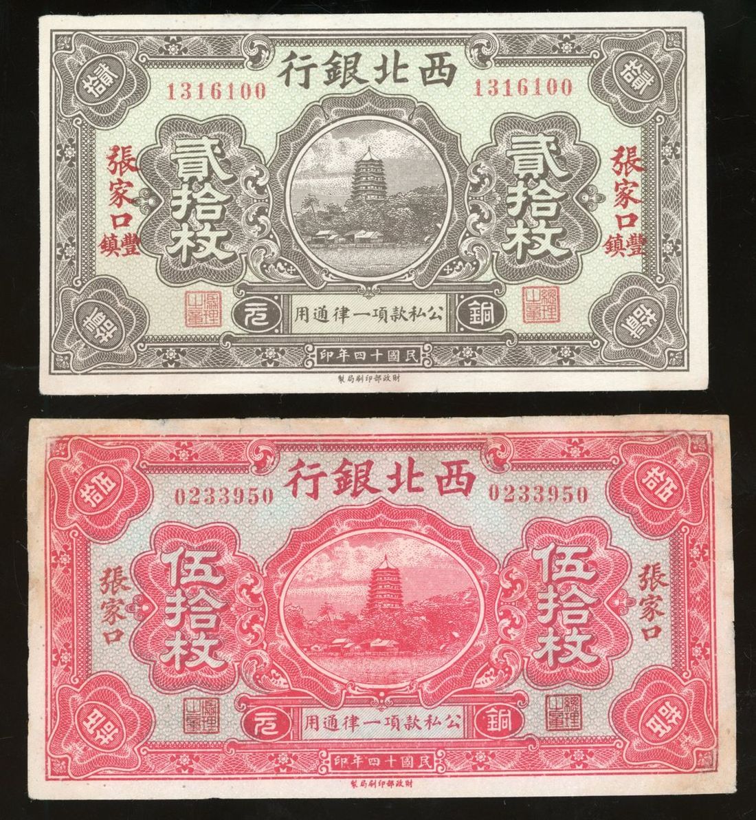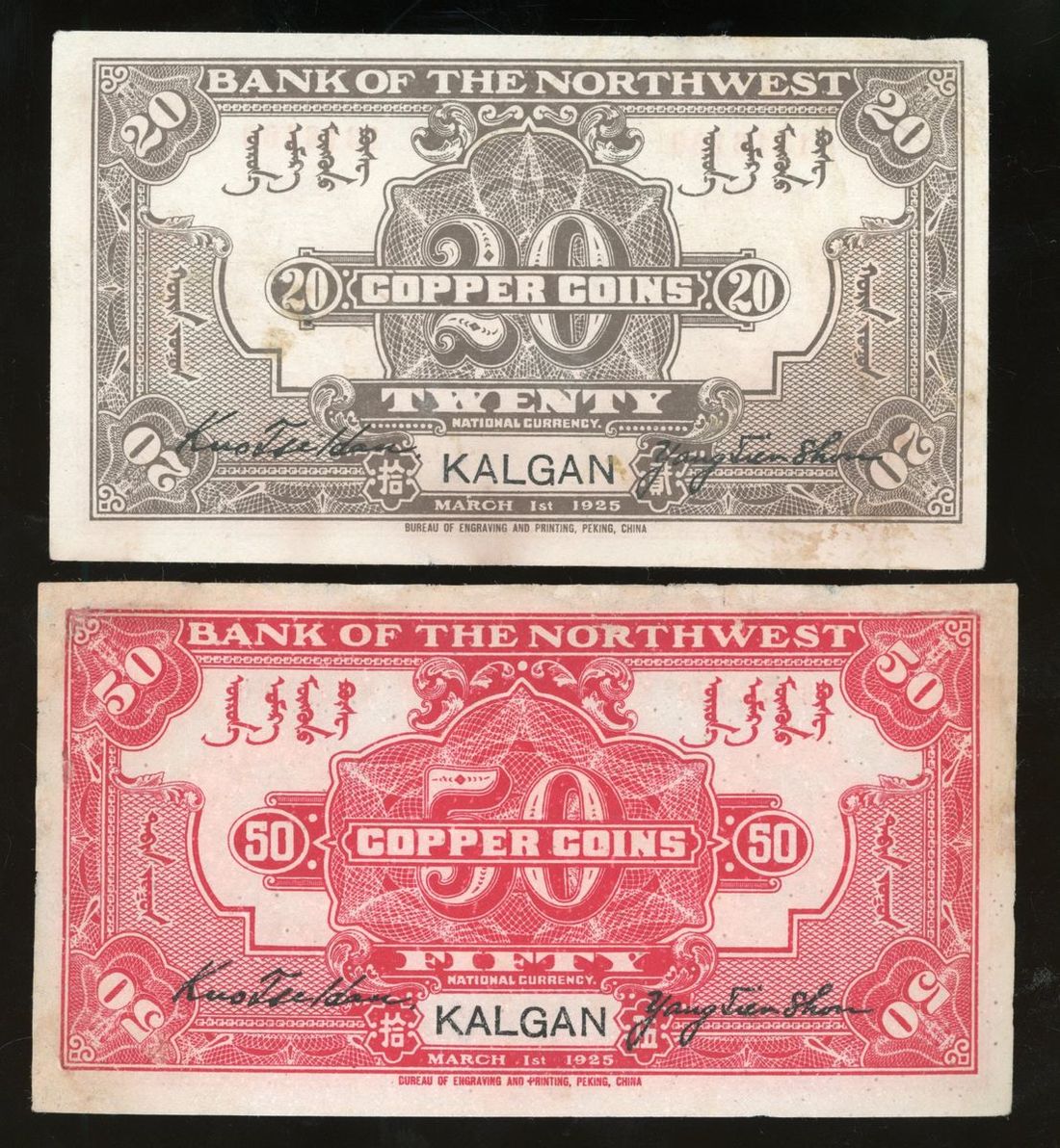 Bank of the NorthWest, China, a pair, Year 14 (1925), including 20 and 50 coppers, Kalgan, (Pick S3865a, S3866a), stained, extremely fine (2)